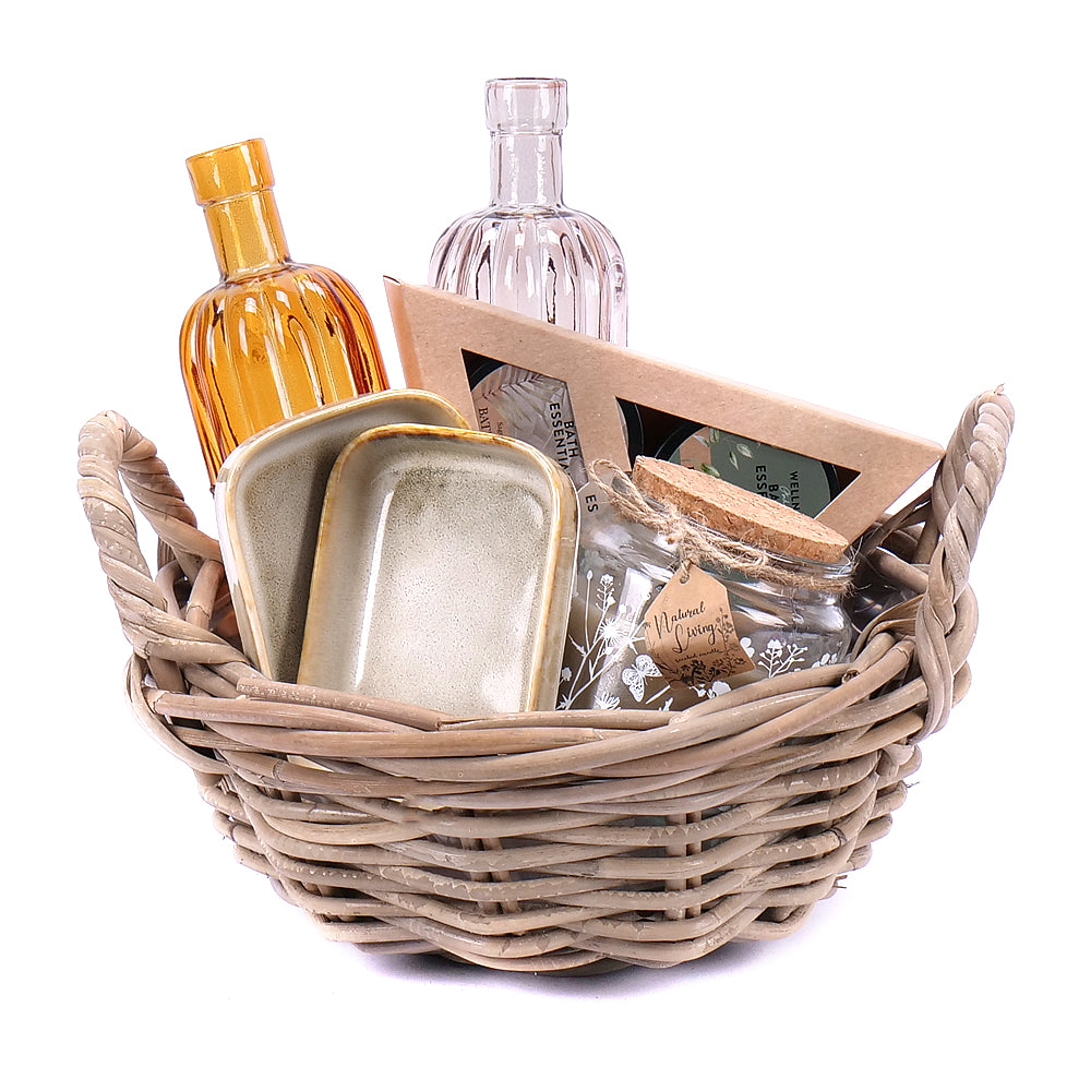Praktický darček s kúpeľňovým setom - 1 ks, dekoračnými vázami - 2 ks, vonnou sklenenou sviečkou - 1 ks, servírovacou miskou - 2 ks. Súčasťou setu je ratanový kôš s rúčkami so všestranným využitím.