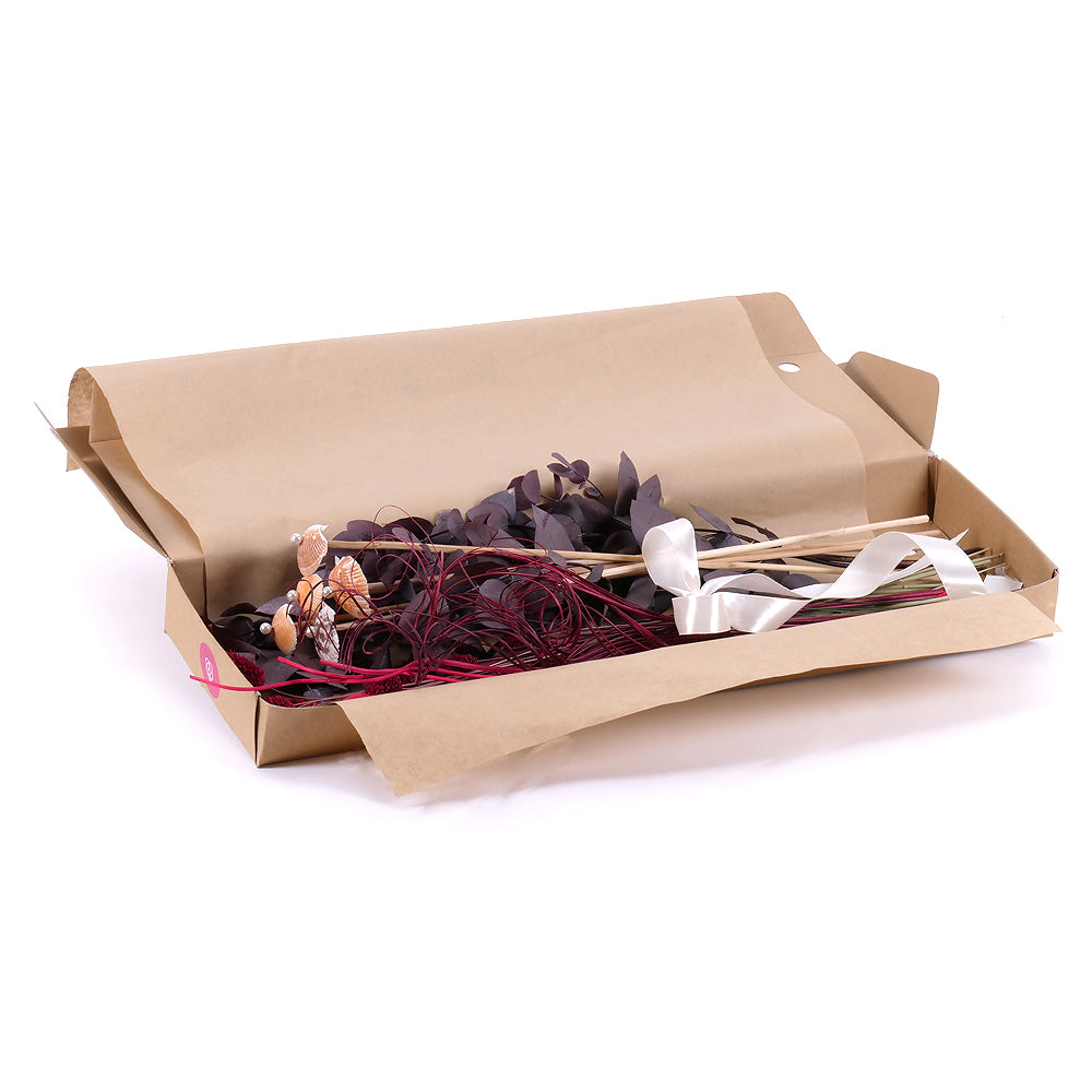 Naaranžujte si vlastnú sušenú kyticu s prírodnými doplnkami a farbenými trávami. Súčasťou kytice je aj saténová stuha.