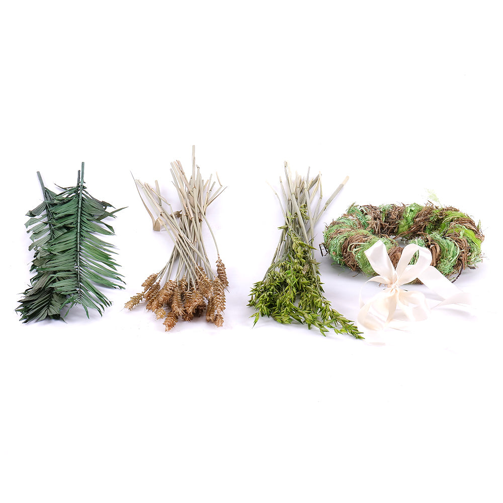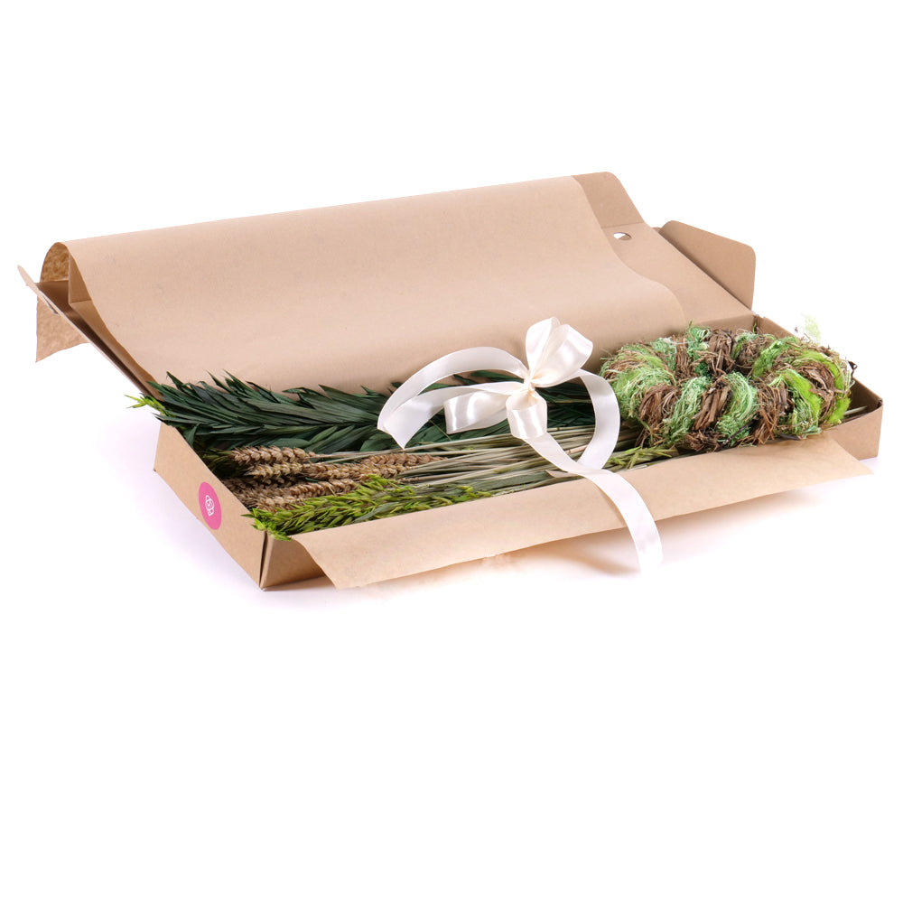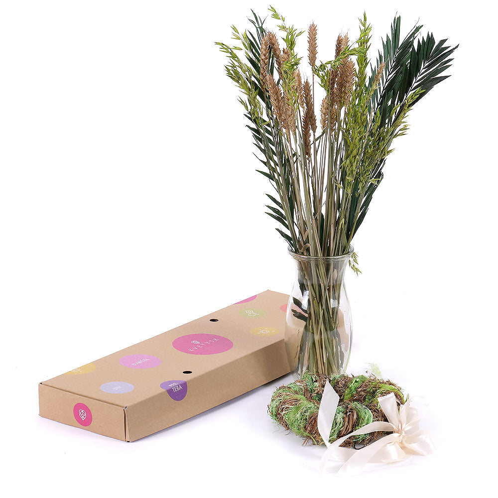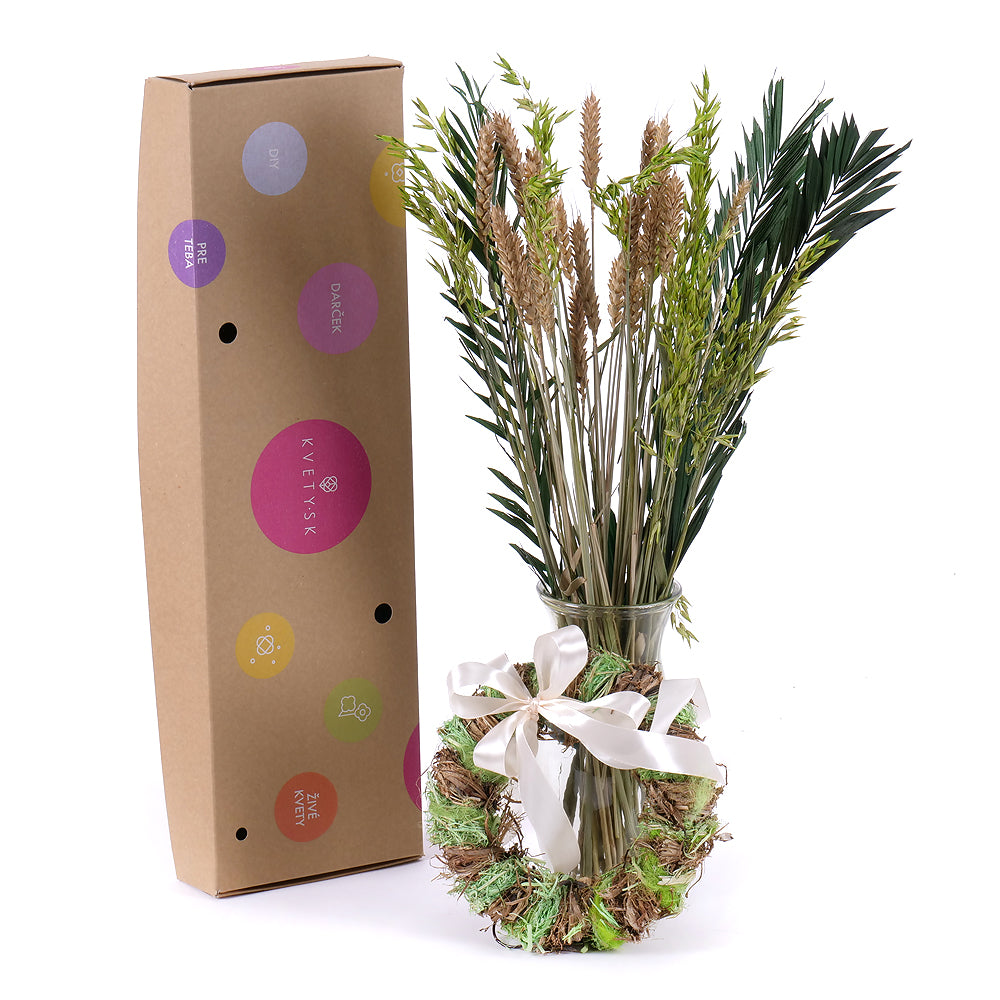 Naaranžujte si vlastnú sušenú kyticu s prírodnými doplnkami a farbenými trávami. Súčasťou kytice je veniec a saténová stuha.