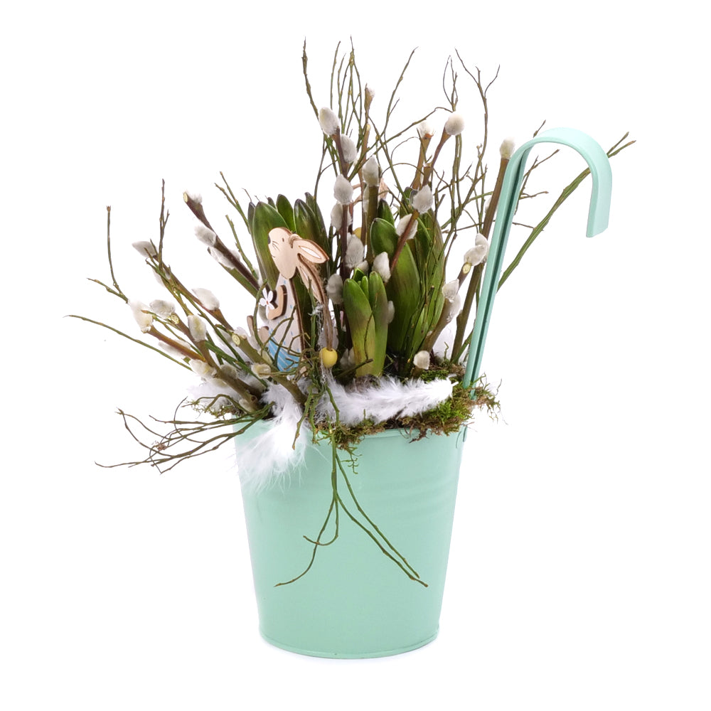 Hyacinty v plechovom obale, salix a drevené zajačiky