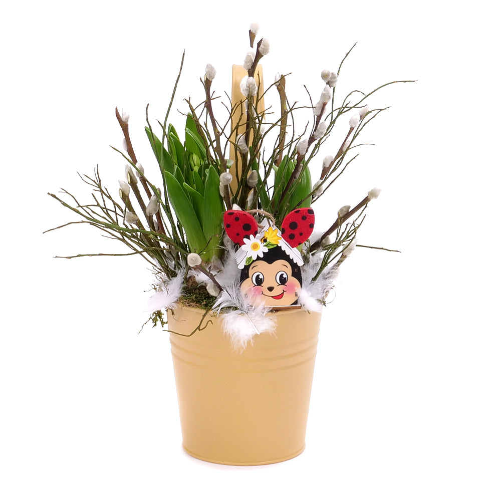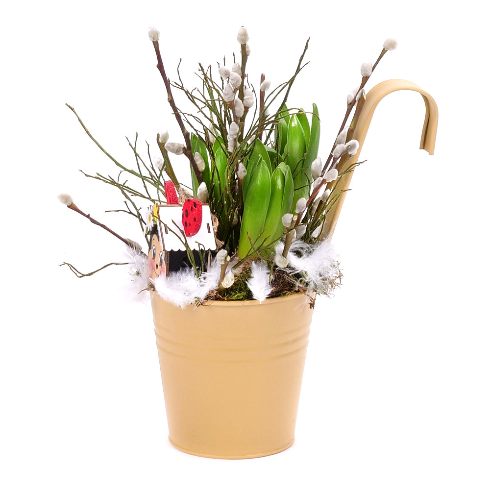 Aranžmán v plechovom obale so živého hyacitnu, salixu a drevenej ozdoby. Vhodný darček k sviatkom Veľkej noci ako dekorácia na stôl či na zavesenie na balkón alebo terasu. Aranžmány sú starostlivo zabalené a zasielané v darčekových prepravných krabiciach spoločnosti Kvety.sk.