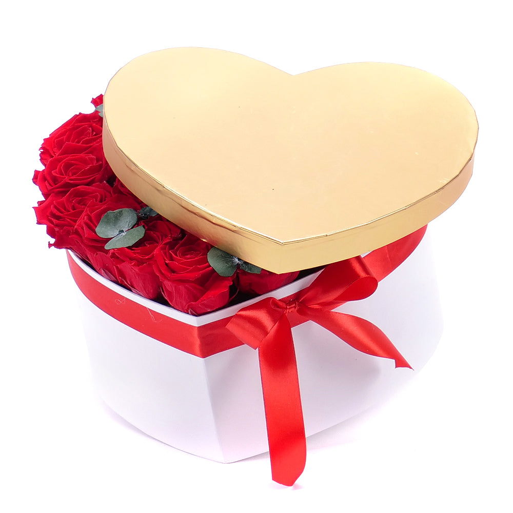 Exkluzívny flower box s preparovanými In eterno ružami červenej farby doplnený preparovaným eukalyptom a saténovou stuhou.