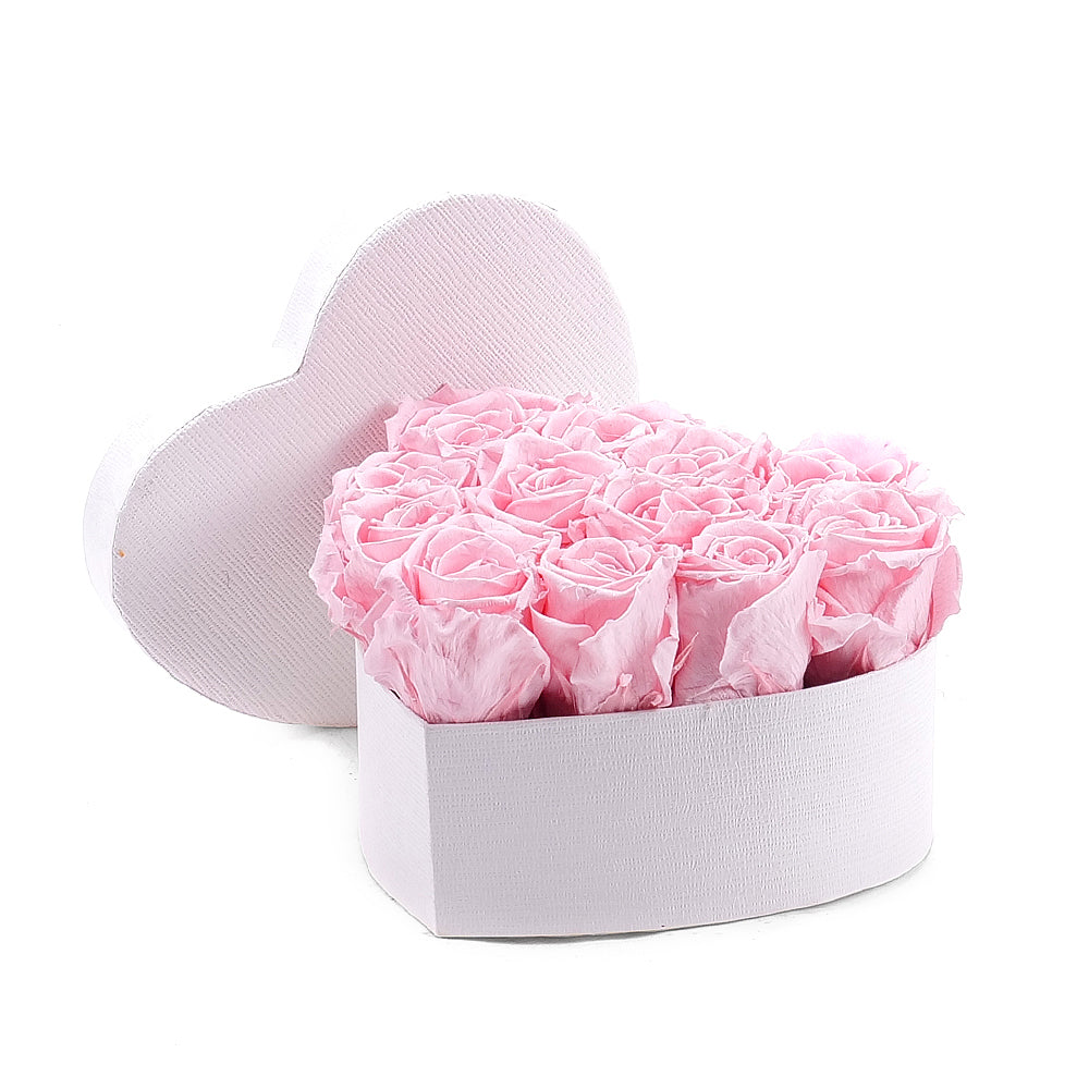 Flower box v tvare srdca s In eterno večnými preparovanými ružovými ružami.