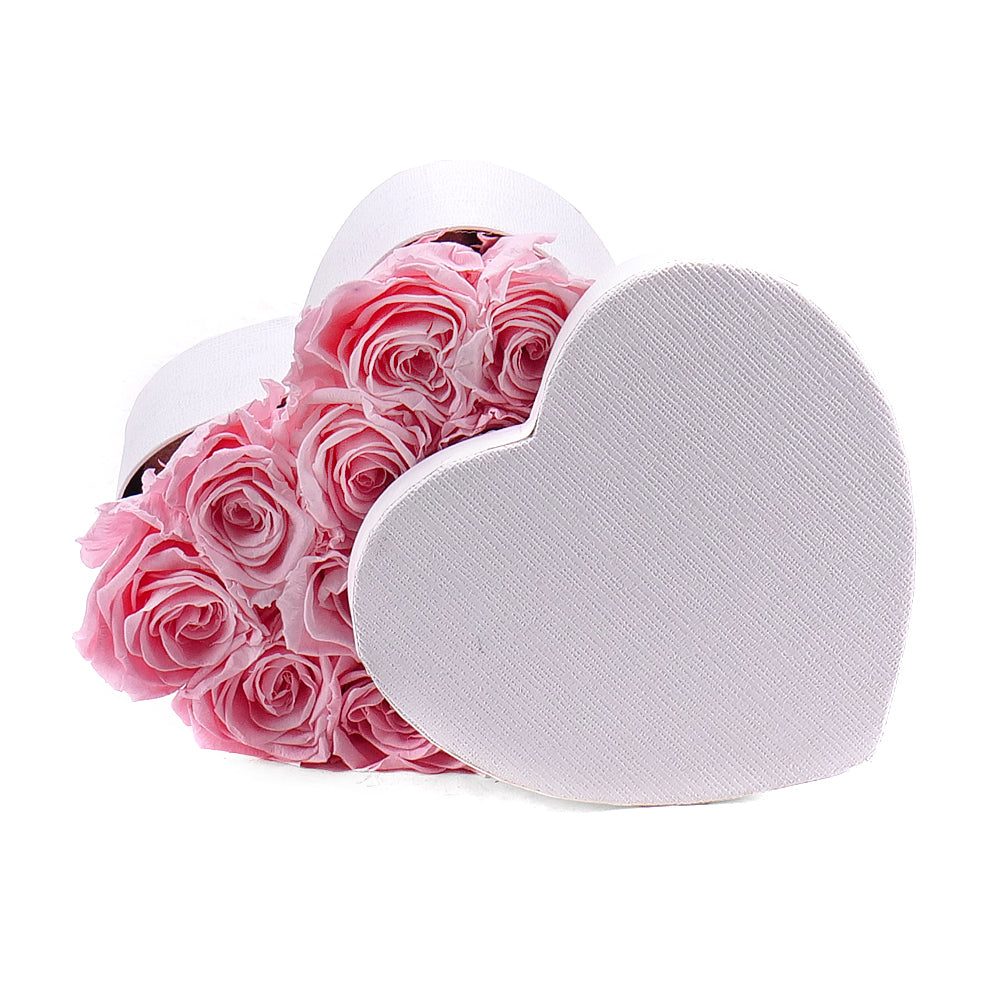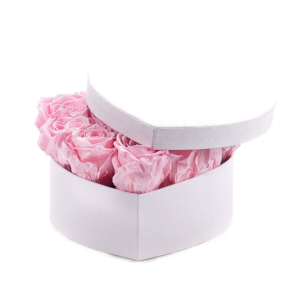 Flower box v tvare srdca s In eterno večnými preparovanými ružovými ružami. Čítať viac