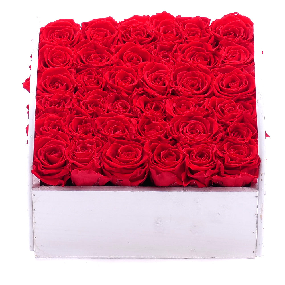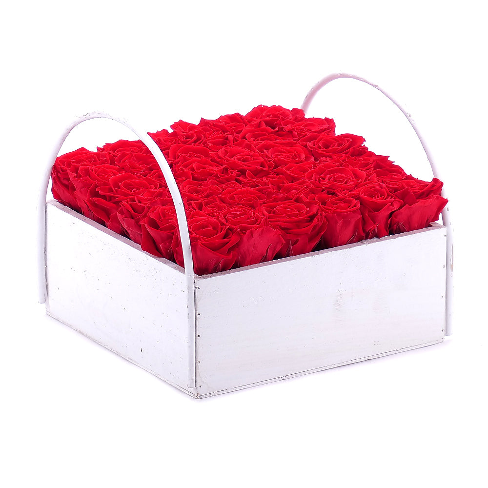 Romantický drevený box s In Eterno červenými ružami.