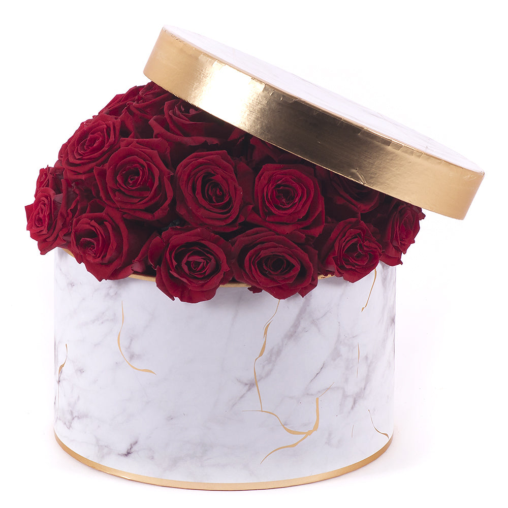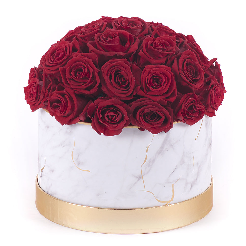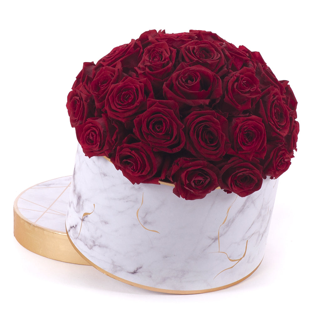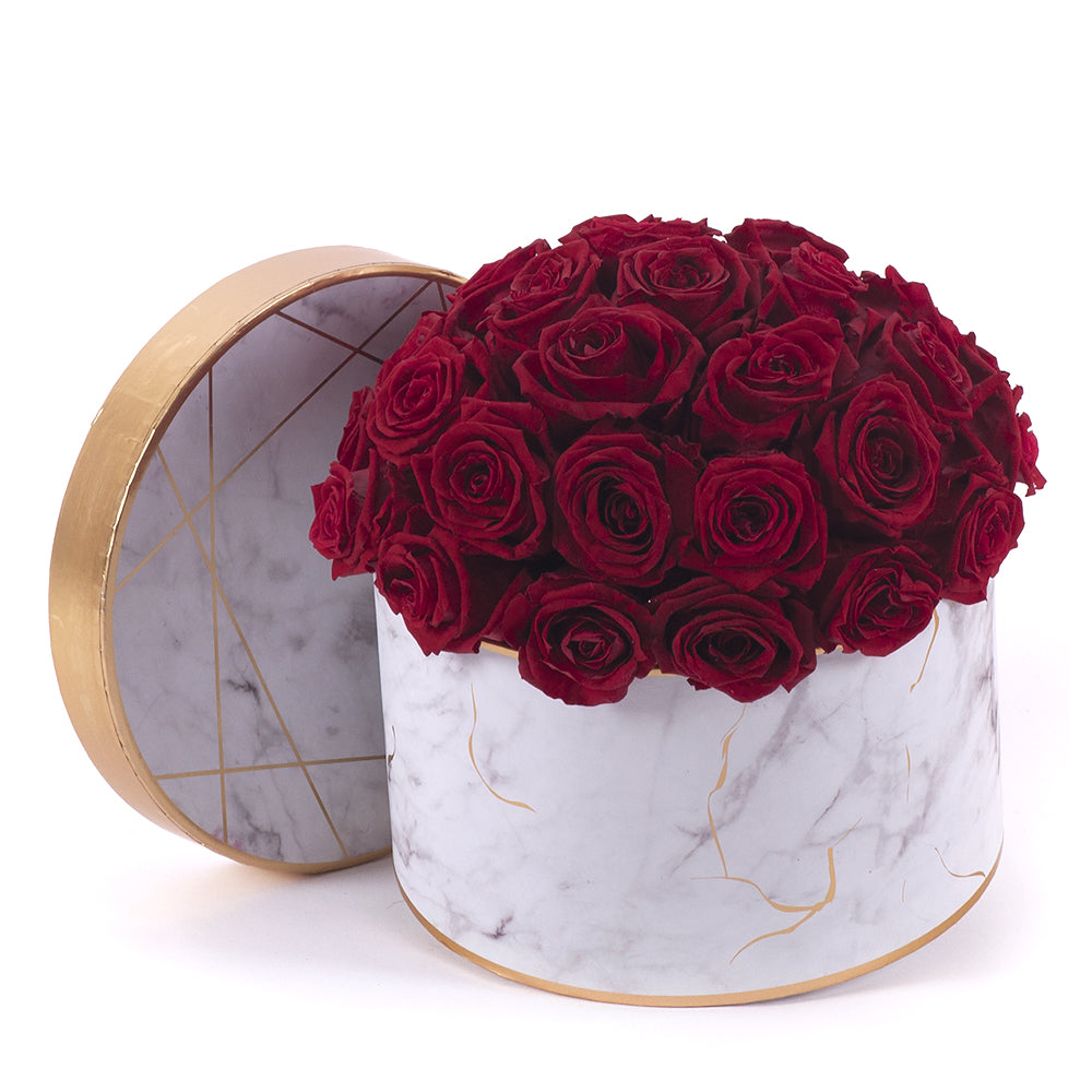 Luxusný mramorovaný flower box so zlatým lemom a 35 červenými In Eterno ružami.
