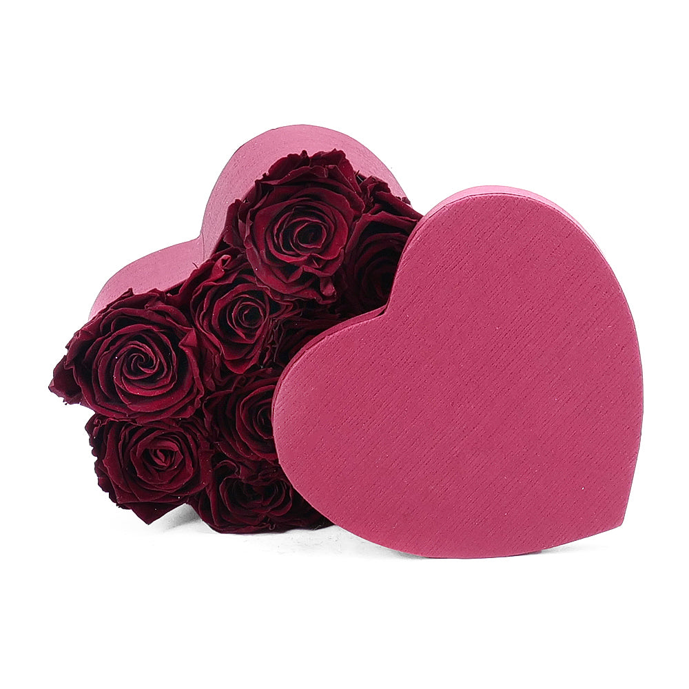 Flower box v tvare srdca s In eterno preparovanými bordovými ružami.