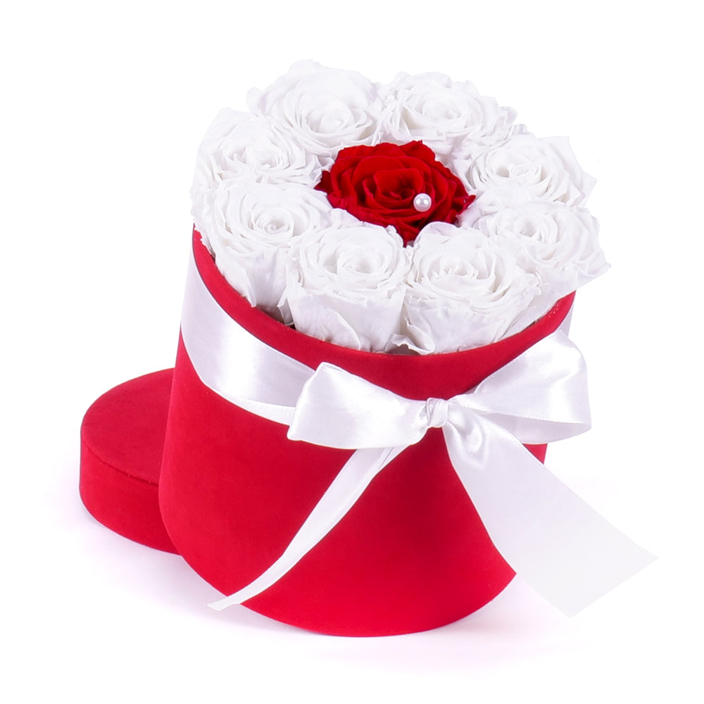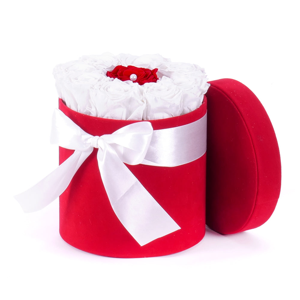 Oválny zamatový flower box s bielymi In Eterno ružami a jednou červenou In eterno ružou. Čítať viac