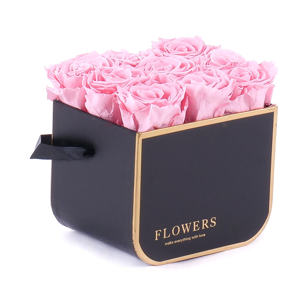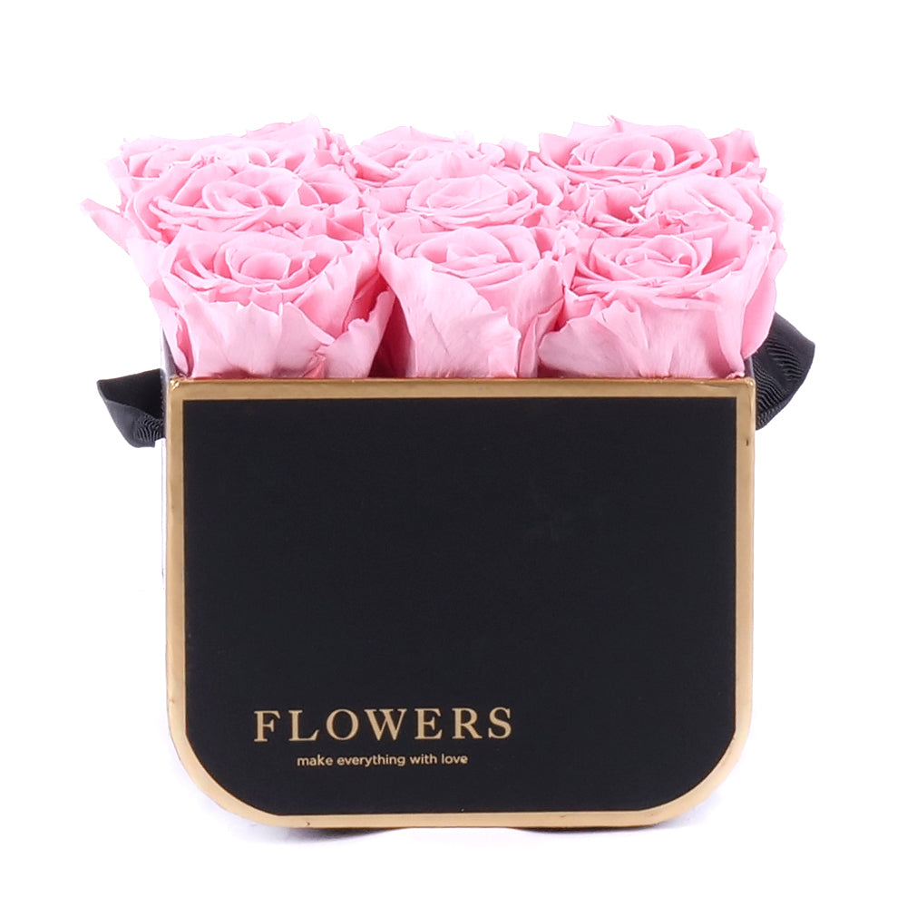 Luxusný flower box s jemnými ružovými In Eterno ružami, ktoré vyzerajú ako živé. Čítať viac