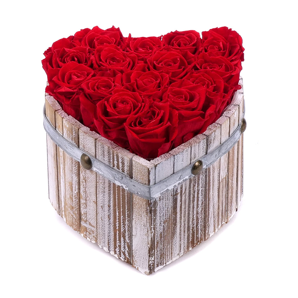 Exkluzívny drevený box v tvare srdca s červenými preparovanými In eterno ružami, ktoré vydržia dlhý čas. Je ideálnym darčekom na výročie, svadbu, narodeniny či meniny. Štýlový dizajn aranžmánu pripomína tie najkrajšie okamihy každý deň. Aranžmány sú starostlivo zabalené a zasielané v darčekových prepravných krabiciach spoločnosti Kvety.sk. Čítať viac
