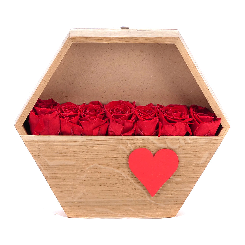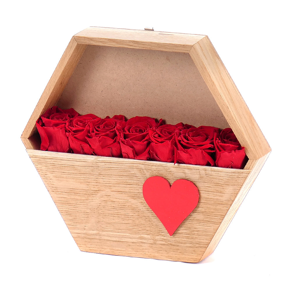 Exkluzívny drevený box so srdiečkom a In eterno večnými preparovanými červenými ružami. Aranžmán je vhodný ako dekorácia na položenie alebo zavesenie.