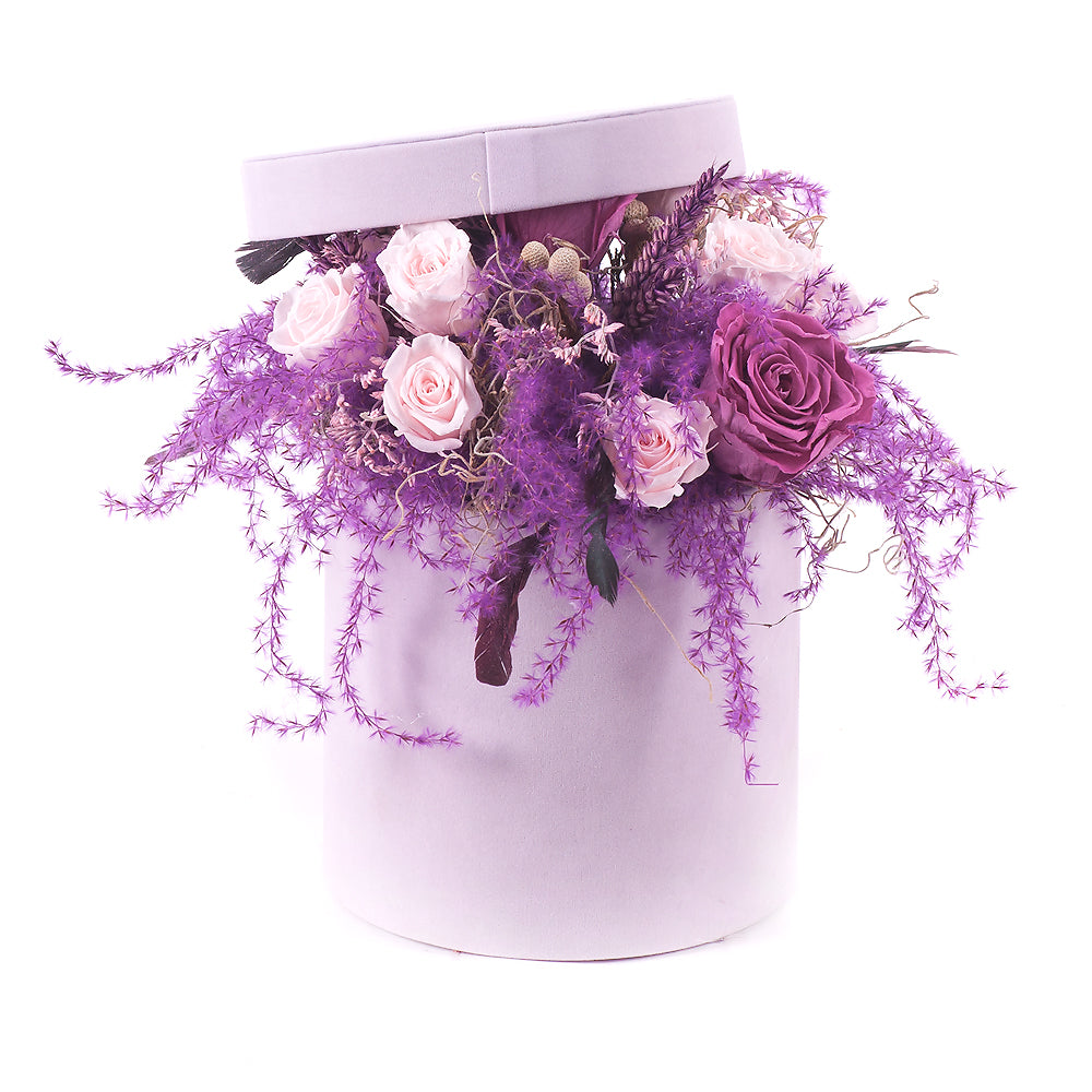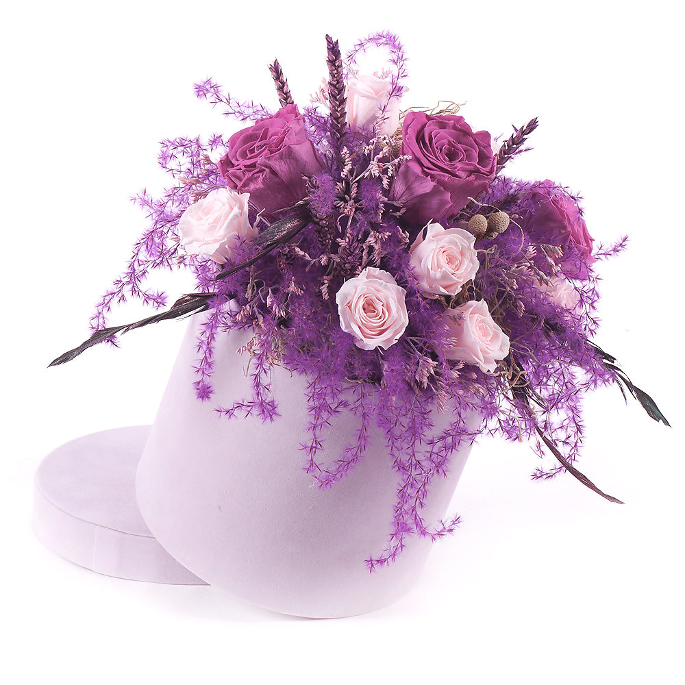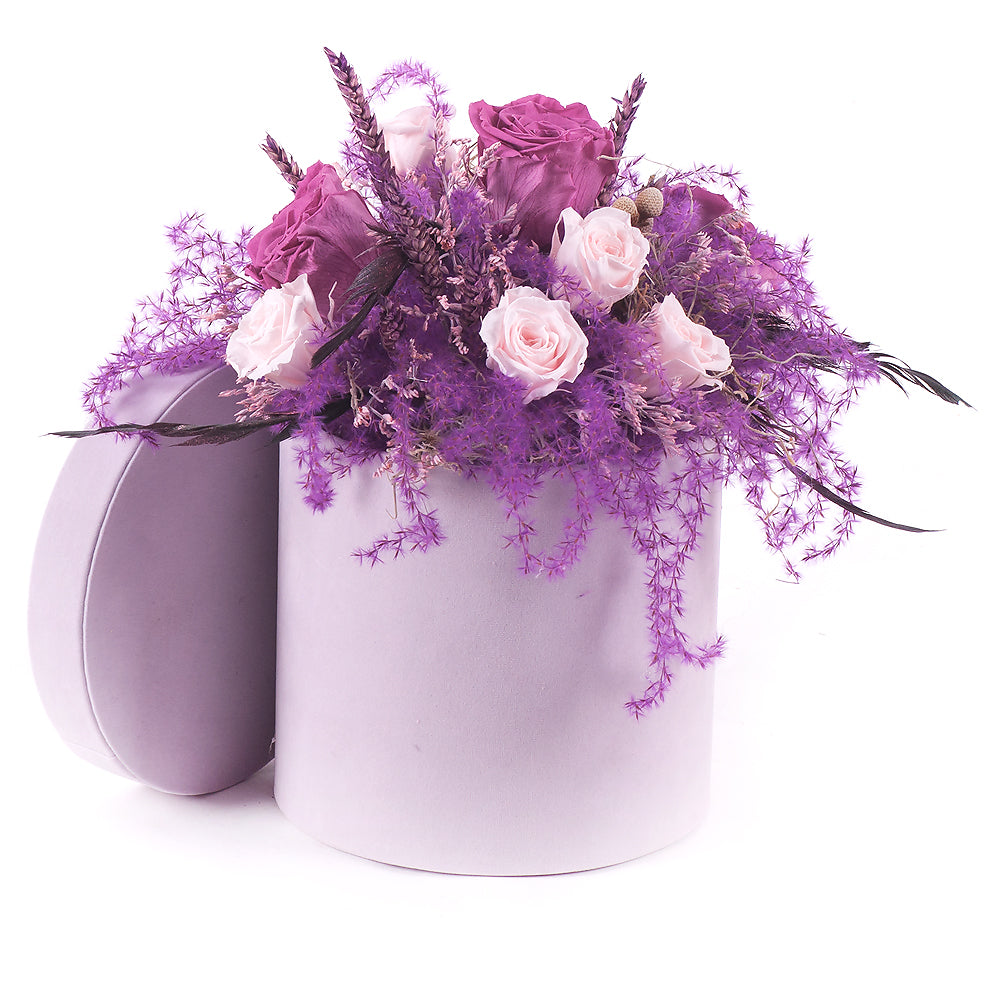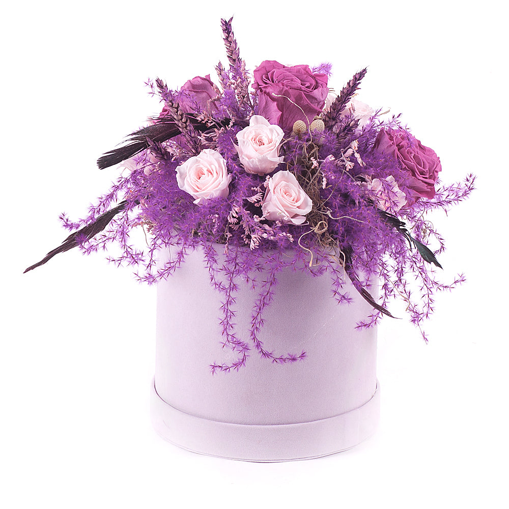 Flower box s nevädnúcimi In Eterno ružami a sušenými doplnkami v jemne fialovom prevedení. Čítať viac