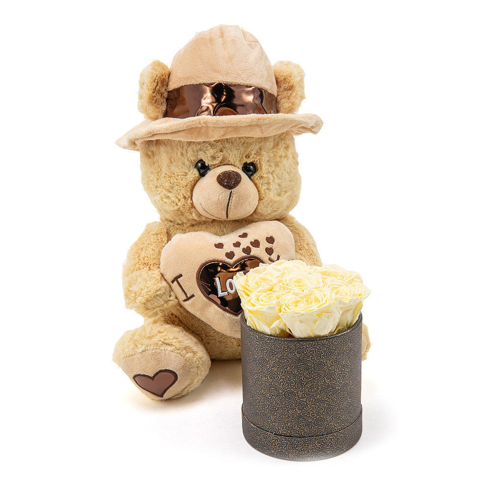 In eterno okrúhly box "7" krémových ruží a plyšový medveď