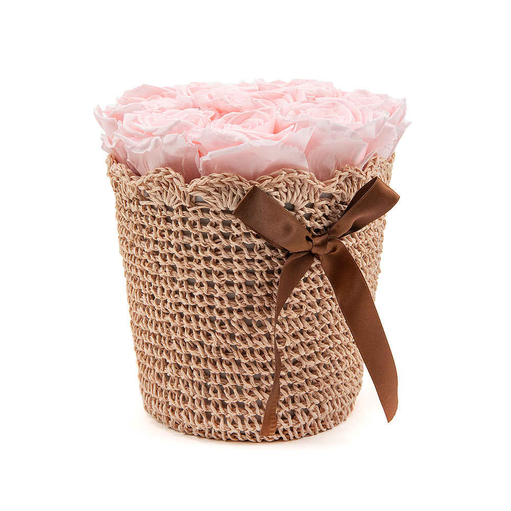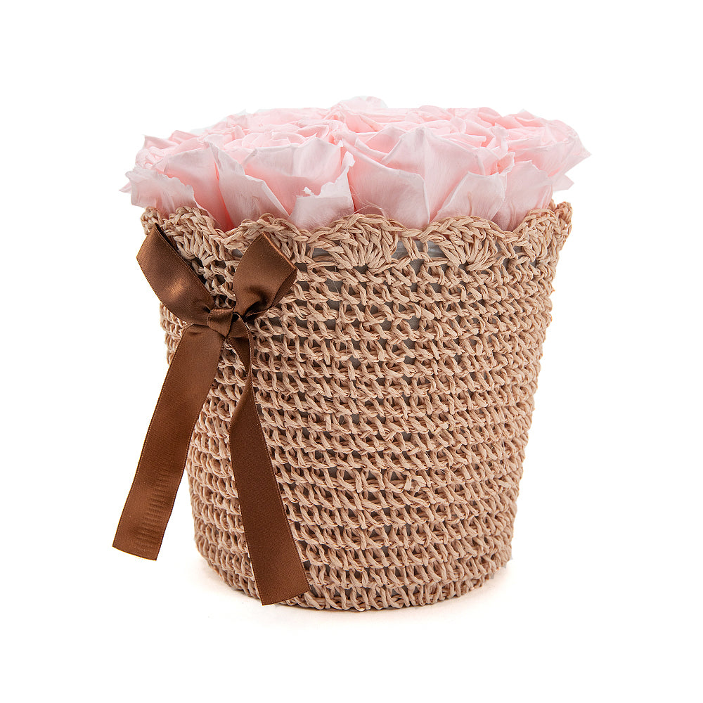 Hnedý pletený košík s jemnými In Eterno ružami ružovej farby. Čítať viac