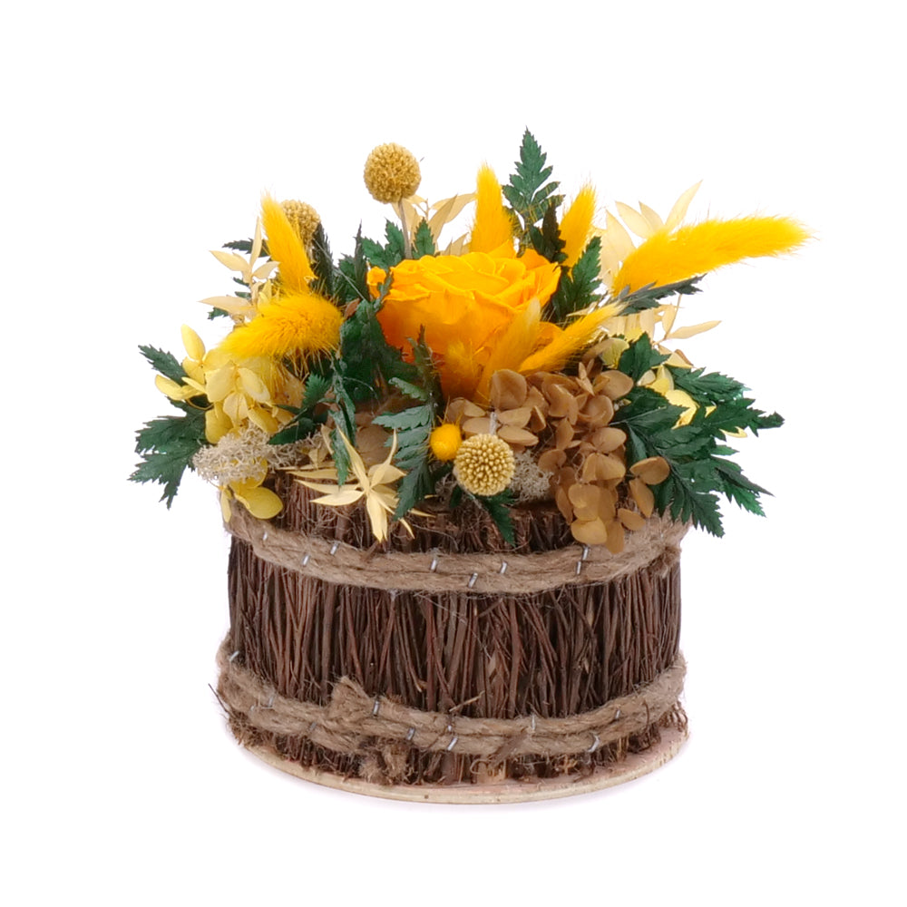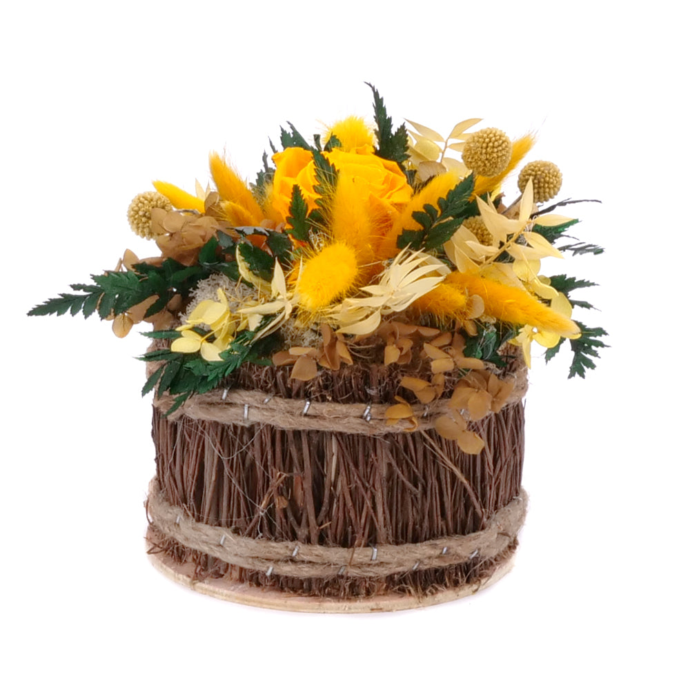 In eterno prútená misa žltá preparovaná ruža, hortenzia a craspedia