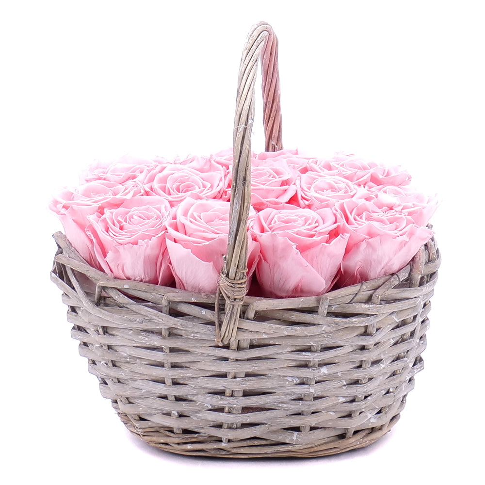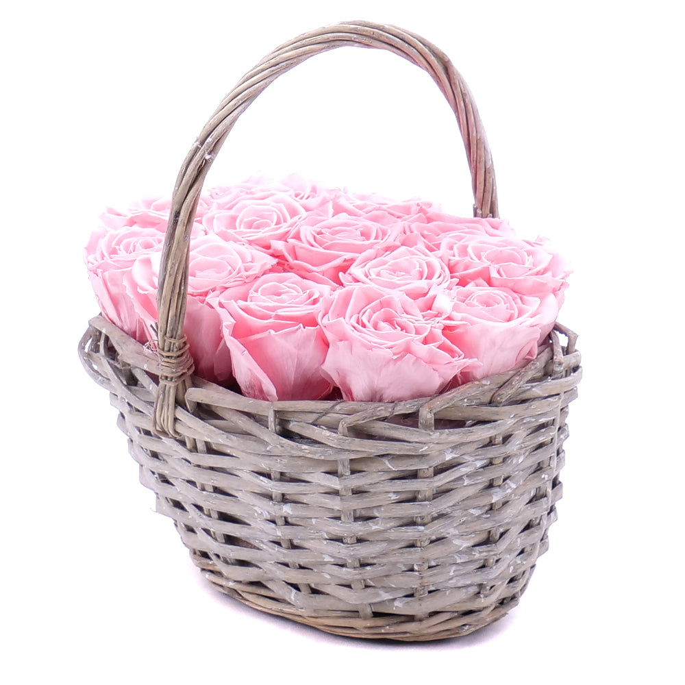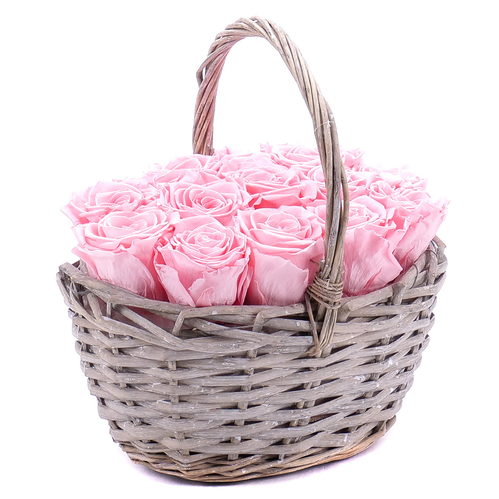 In eterno prútený košík 13 ružových ruží baby pink