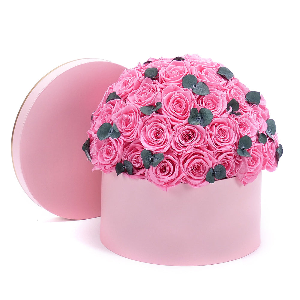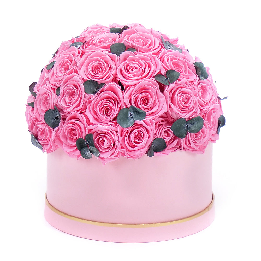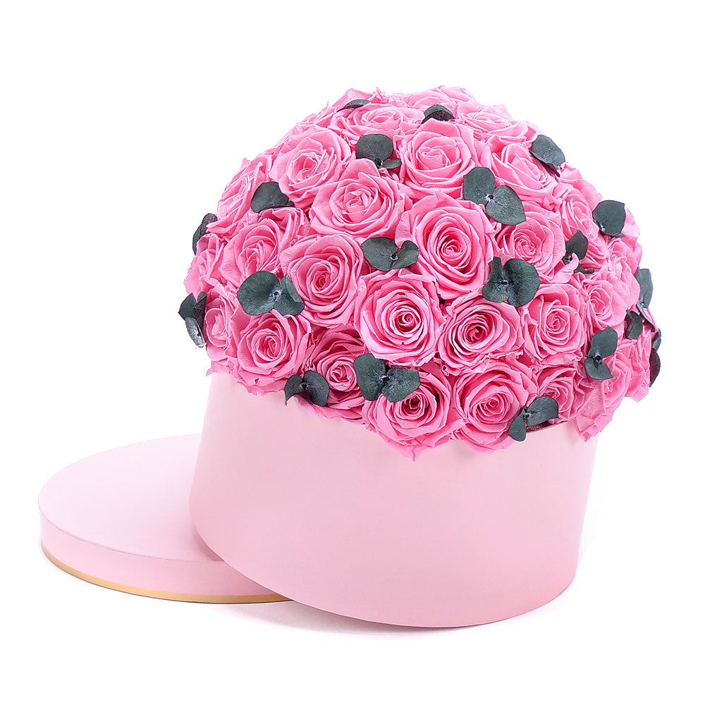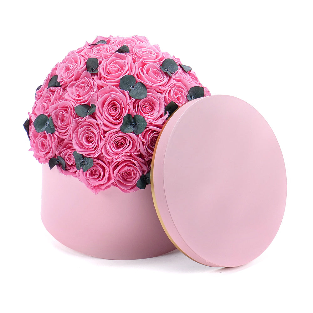 In eterno ružový okrúhly box "XL" 47 ružových ruží eukalyptus