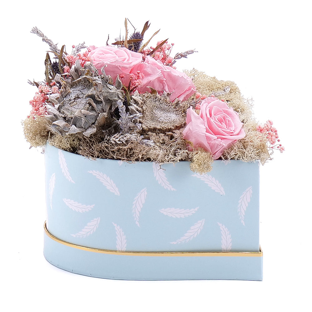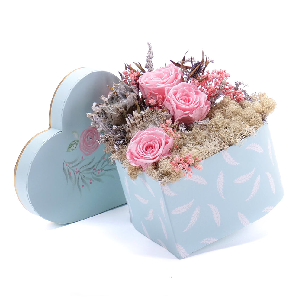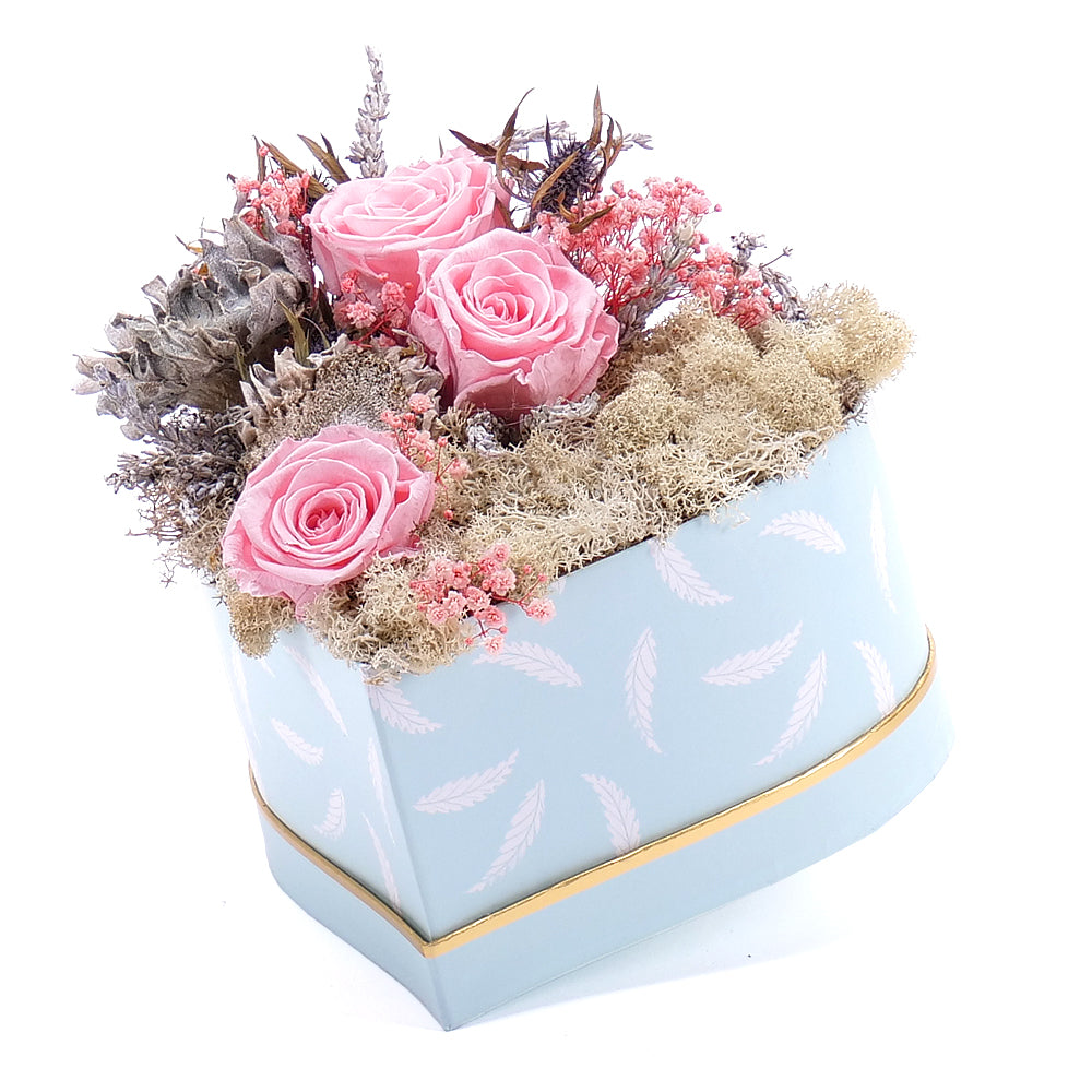 Jemný flower box s preparovanými ružovými ružami, dekoračnými prírodnými doplnkami a preparovaným machom.