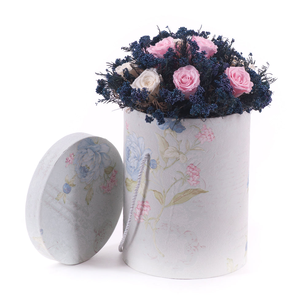Potešte tých na ktorých Vám záleží a darujte im jedinečný flower box v kombinácii ružových a bielych In Eterno ruží s modrou gypsomilou v štýle Vintage.
