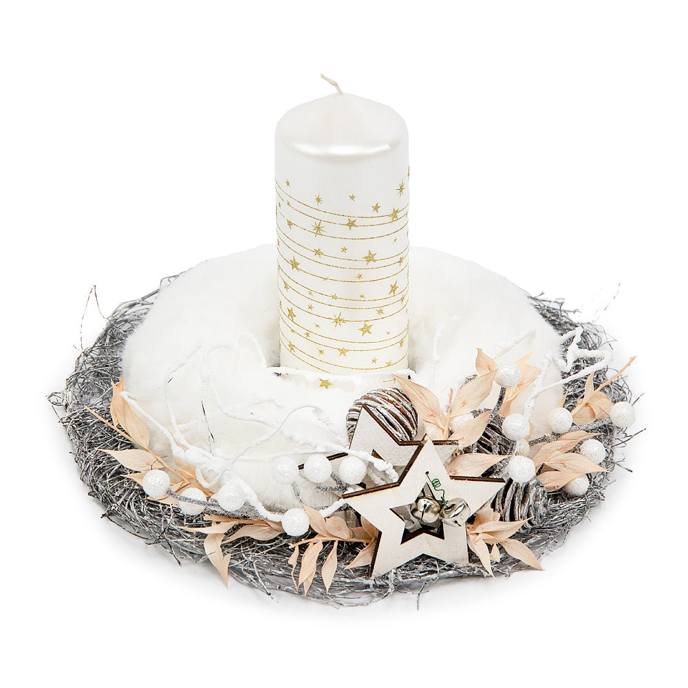 Prírodný veniec s dekoračnými vianočnými doplnkami a sviečkou. Čítať viac