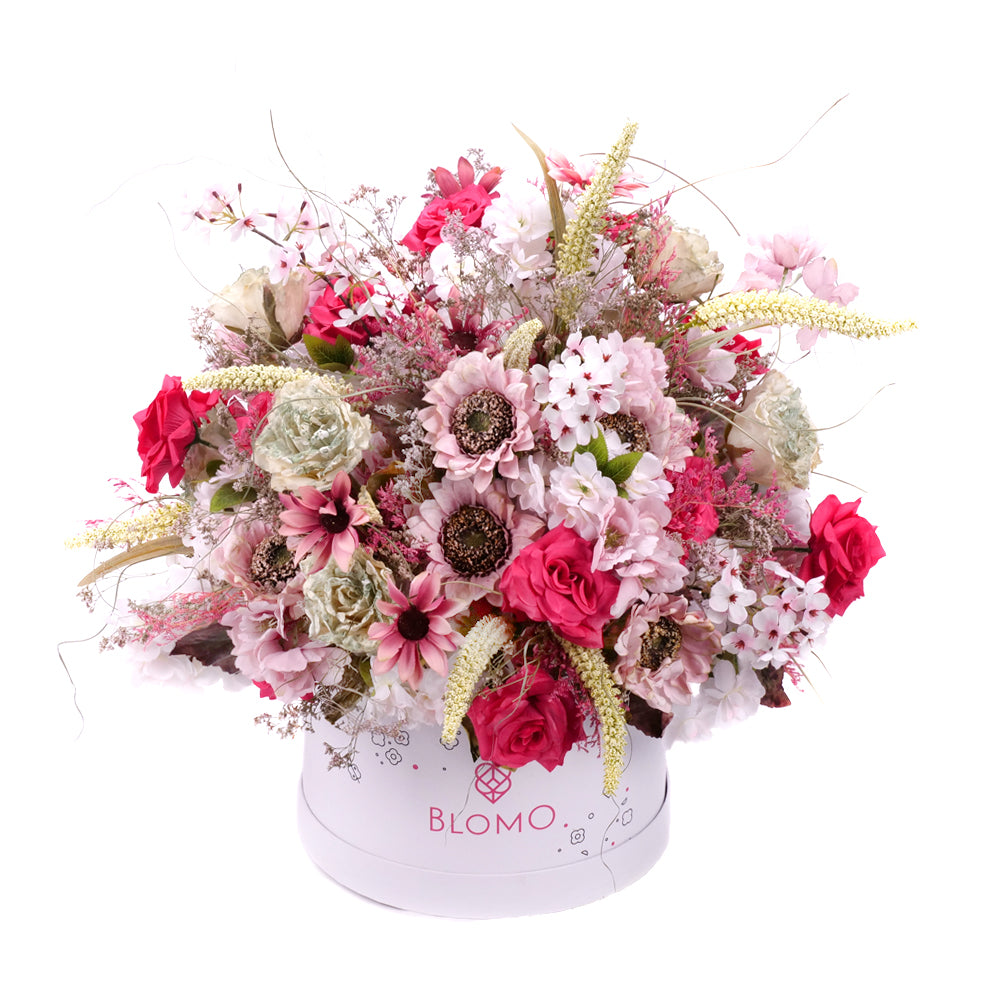 Jemný aranžmán ladený do ružovej a cyklamenovej farby v darčekovom flower boxe obale s umelými kvetmi a prírodnými doplnkami. Aranžmány sú starostlivo zabalené a zasielané v darčekových prepravných krabiciach spoločnosti Kvety.sk.