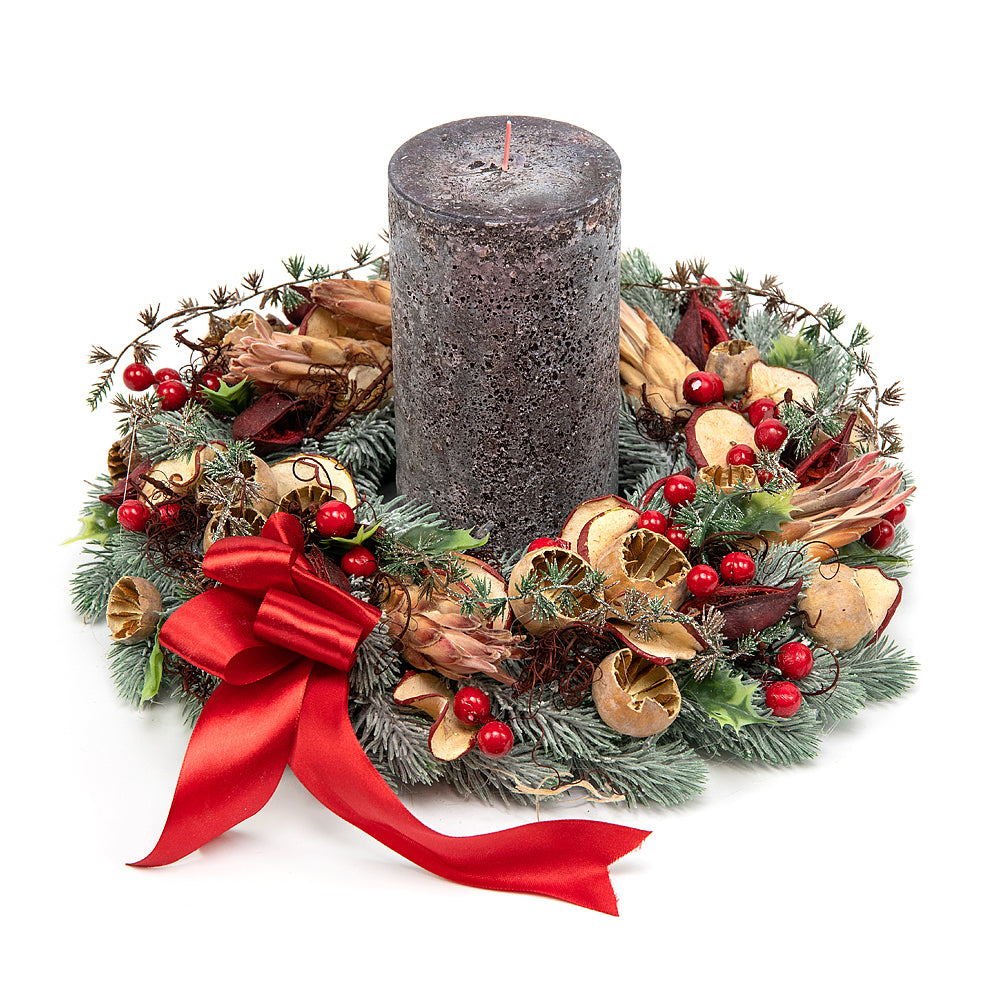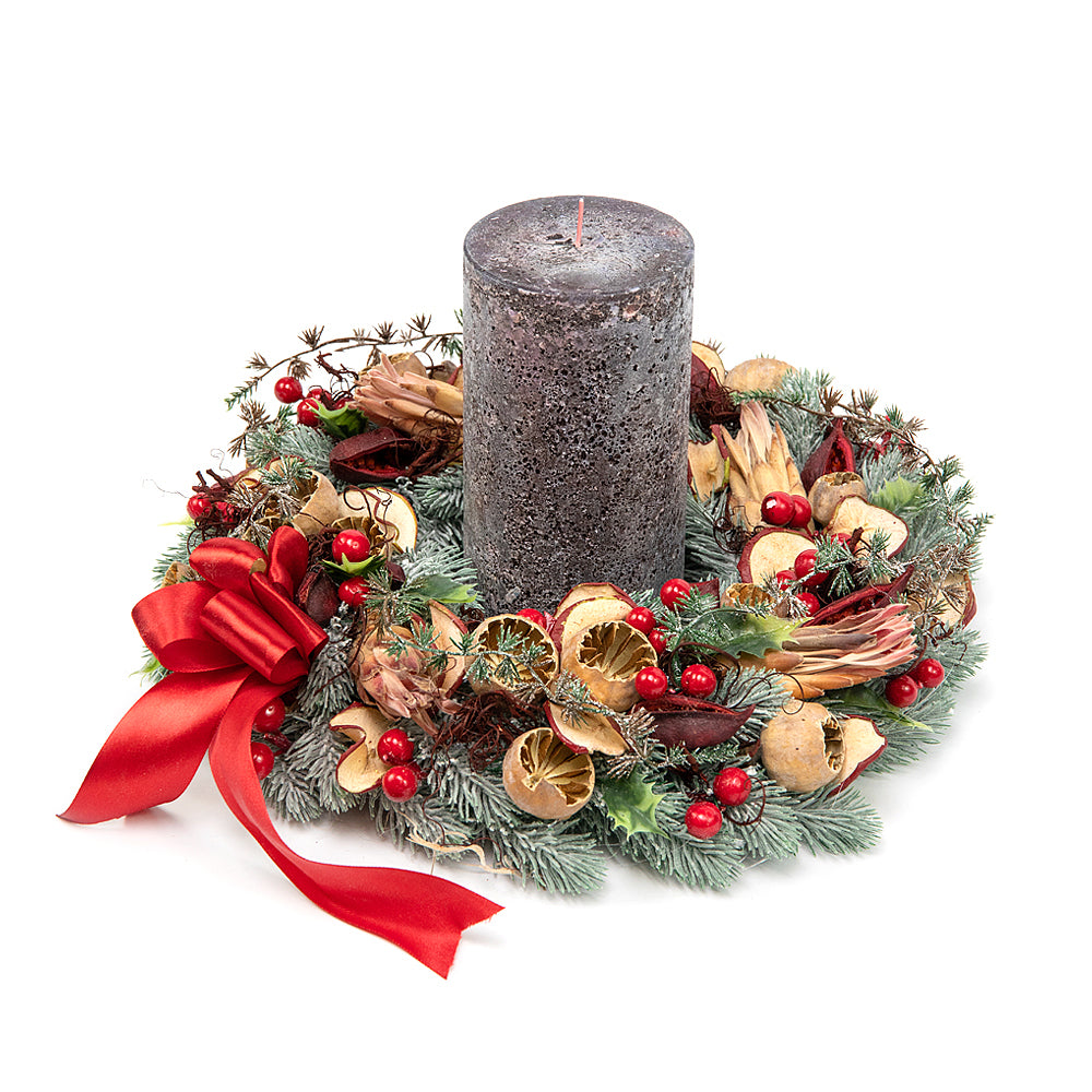 Umelý veniec dozdobený prírodnými a umelými doplnkami so saténovou stuhou. Súčasťou venca je sviečka bordovej farby. Čítať viac