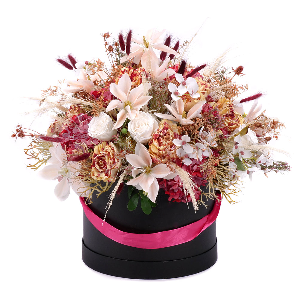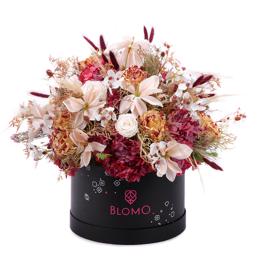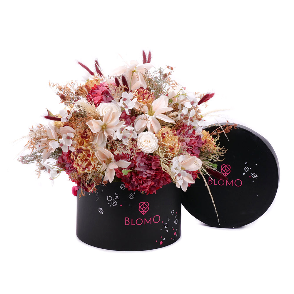 Irigo čierny BLOMO box "L" preparované biele ruže, bordové, žlté a krémové kvety