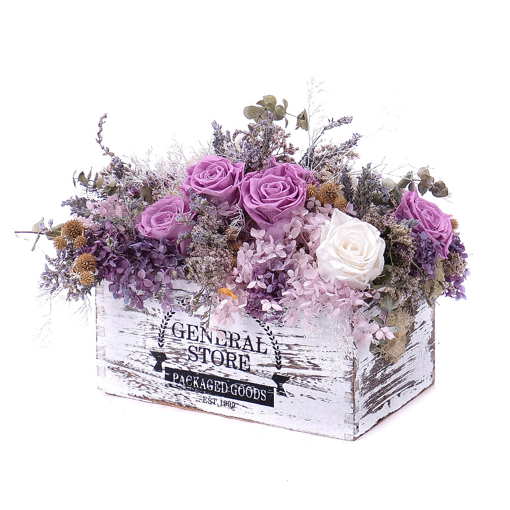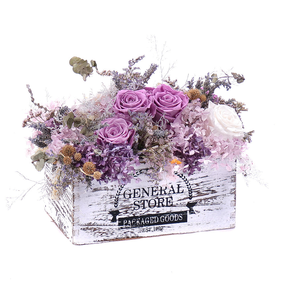 Drevený vintage box s preparovanými In eterno kvetmi ruží fialovej farby, sušenou zeleňou, prírodnými materiálmi a preparovanými doplnkami. Vhodne dotvorí interiér bytu či domu.