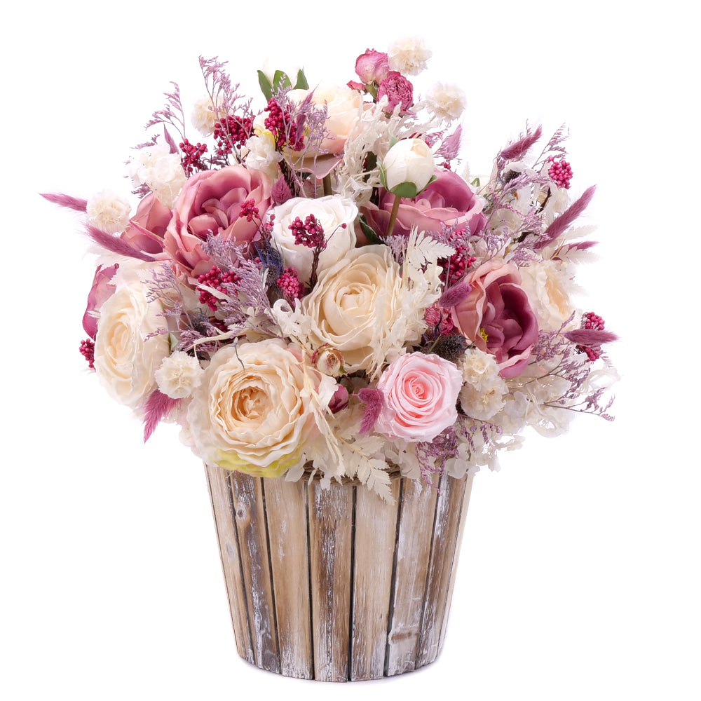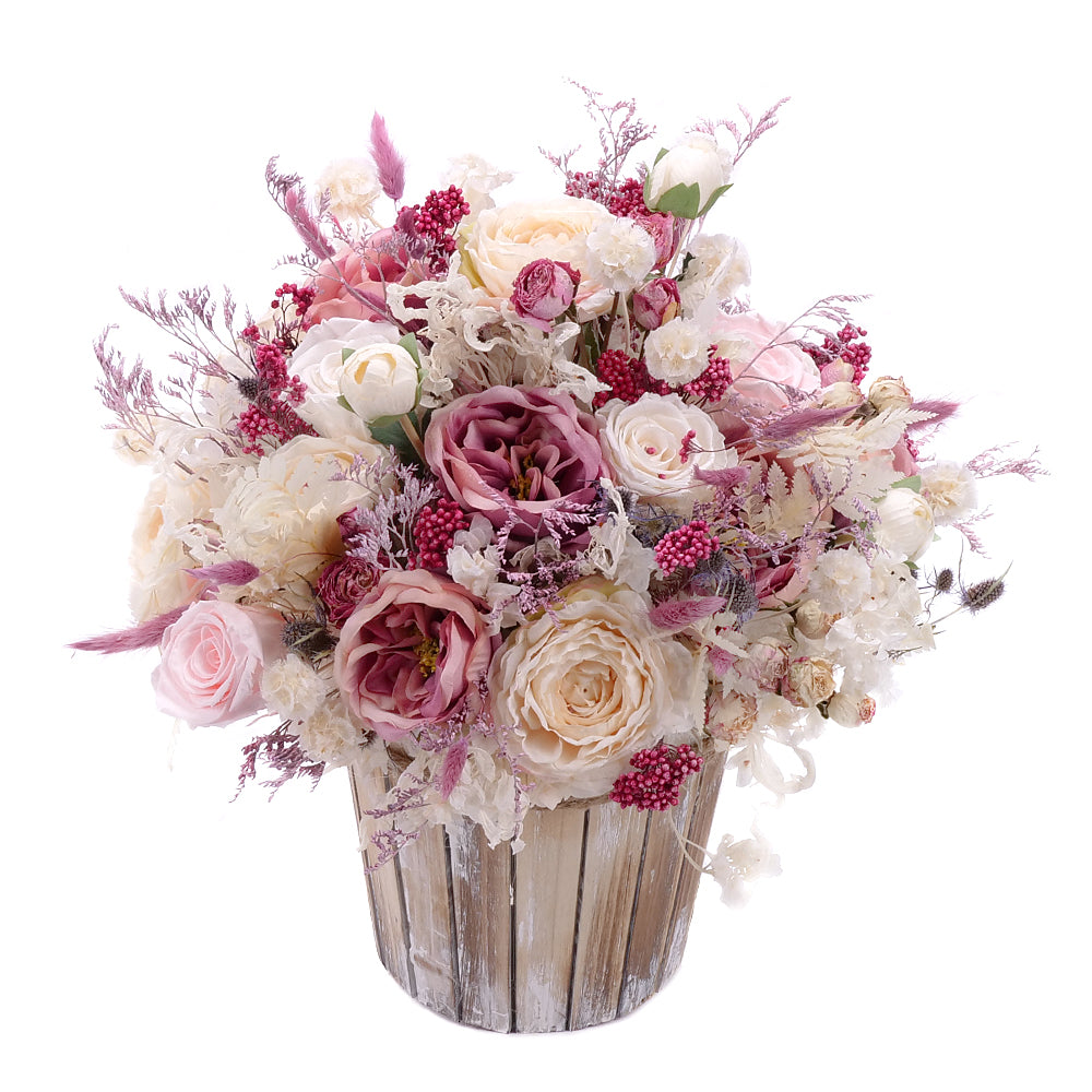 Vintage drevený box s umelými farebnými kvetmi doplnený preparovanými večnými ružami jemnej krémovej a bielej farby. Aranžmány sú starostlivo zabalené a zasielané v darčekových prepravných krabiciach spoločnosti Kvety.sk. Čítať viac
