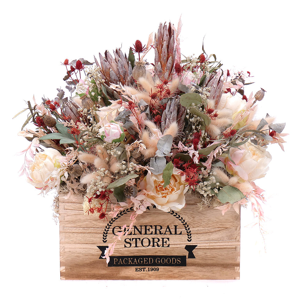 Štýlový drevený box z umelých kvetov, prírodných a sušených doplnkov a preparovaných materiálov. Vhodný darček k sviatku alebo len tak... Čítať viac
