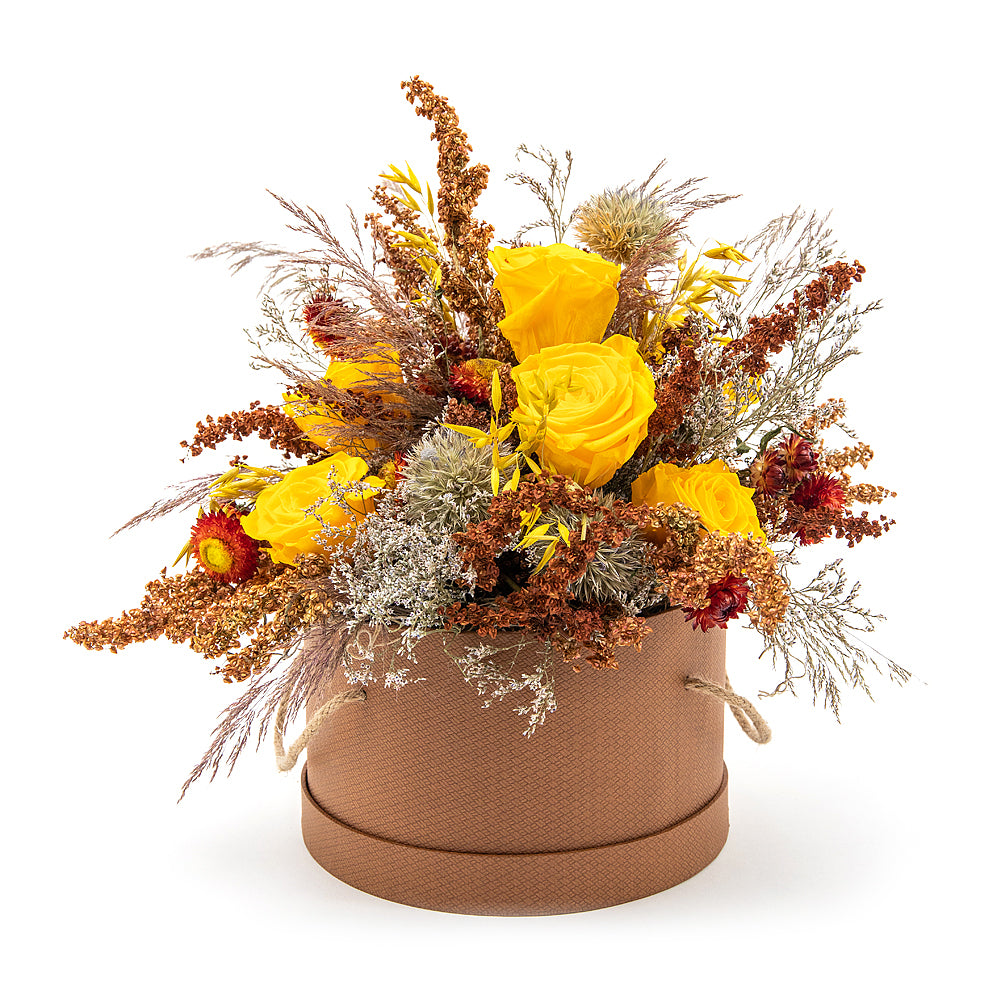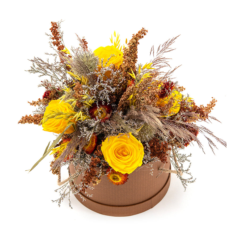 Hnedý flower box s prírodnými doplnkami, dekoračnými trávami a In Eterno žltými ružami. Vhodný ako dekorácia do bytu, domu či... Čítať viac