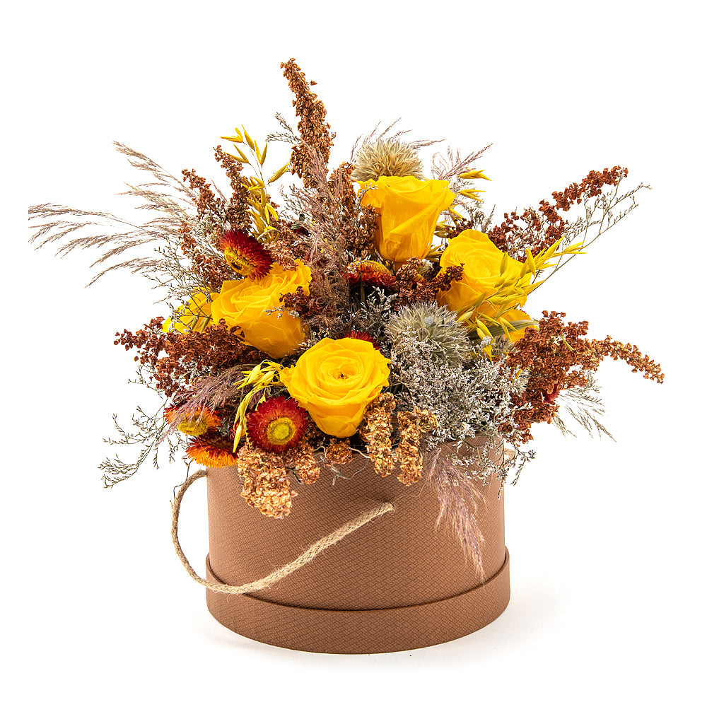 Irigo hnedý okrúhly box "S" a In eterno žlté ruže