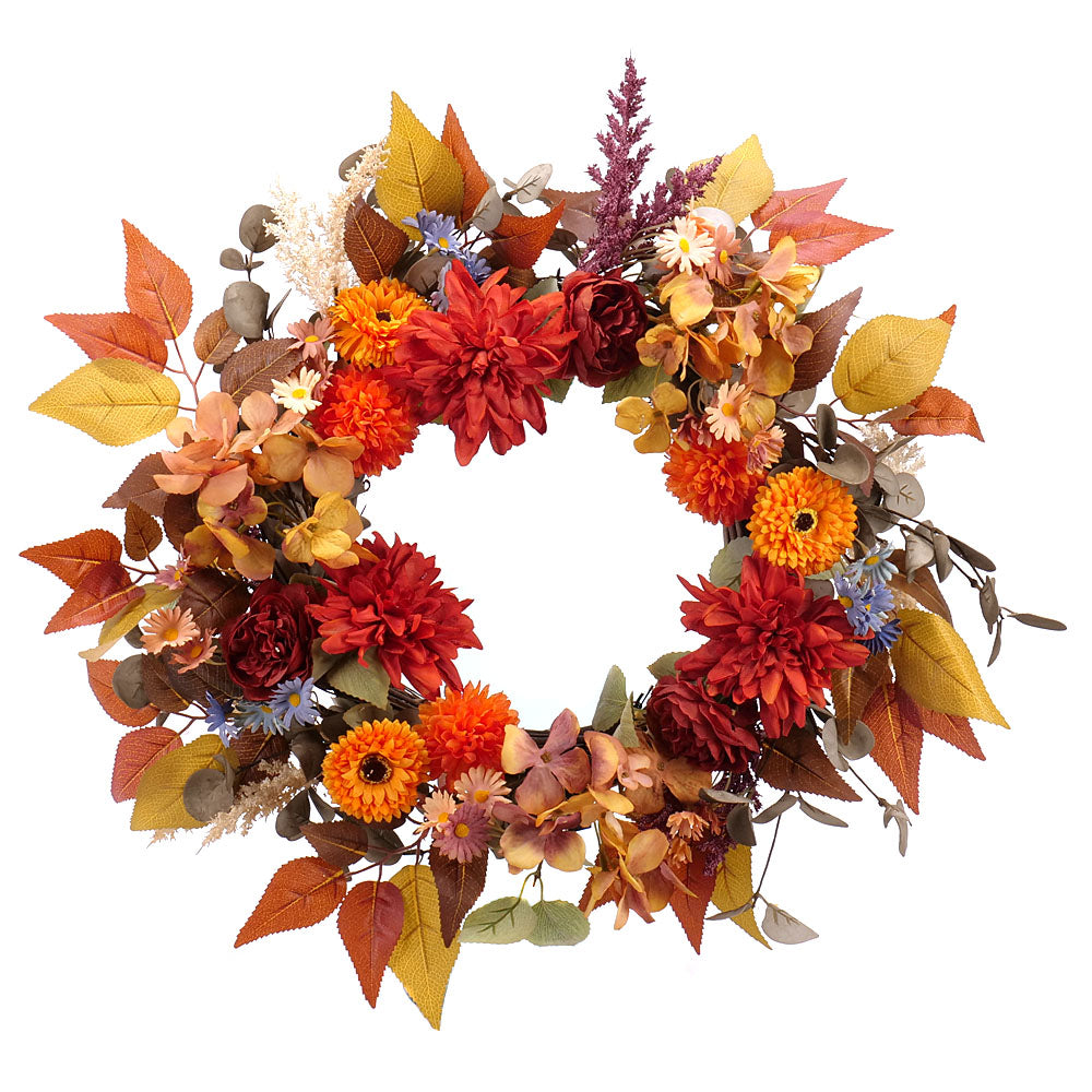 Umelý veniec na dvere na zavesenie alebo na položenie na stôl ako dekorácia v príjemných farbách a odtieňoch žltej, oranžovej a jemnej hnedej farby. Základ venca tvorí prútie.
