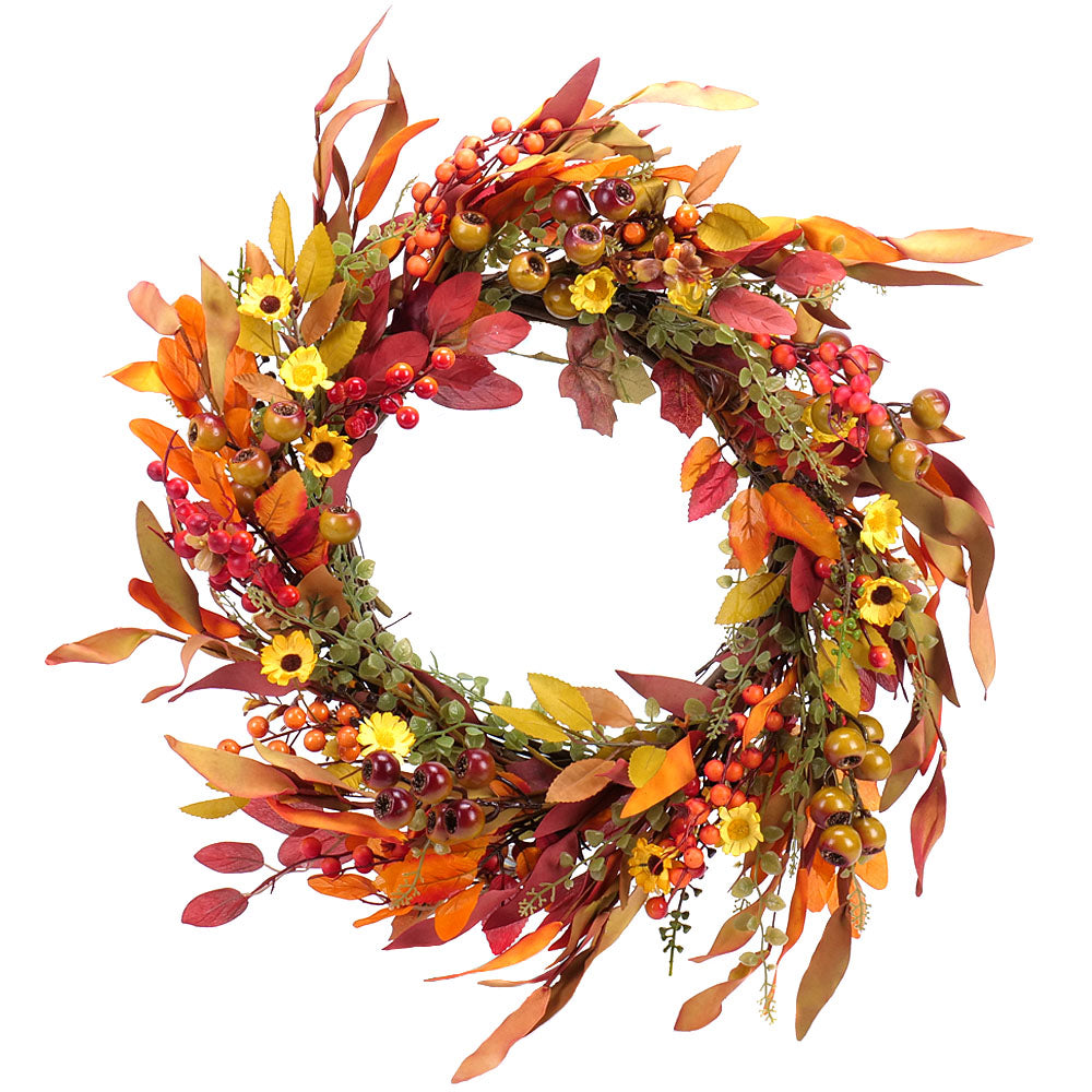 Tento elegantný veniec z prírodného prútia je ozdobený kvalitnými umelými kvetmi v teplých jesenných tónoch – oranžovej, žltej a hnedej. Kombinácia slnečných farieb evokuje krásu padajúceho lístia a vytvára útulnú, príjemnú atmosféru. Skvele sa hodí ako d