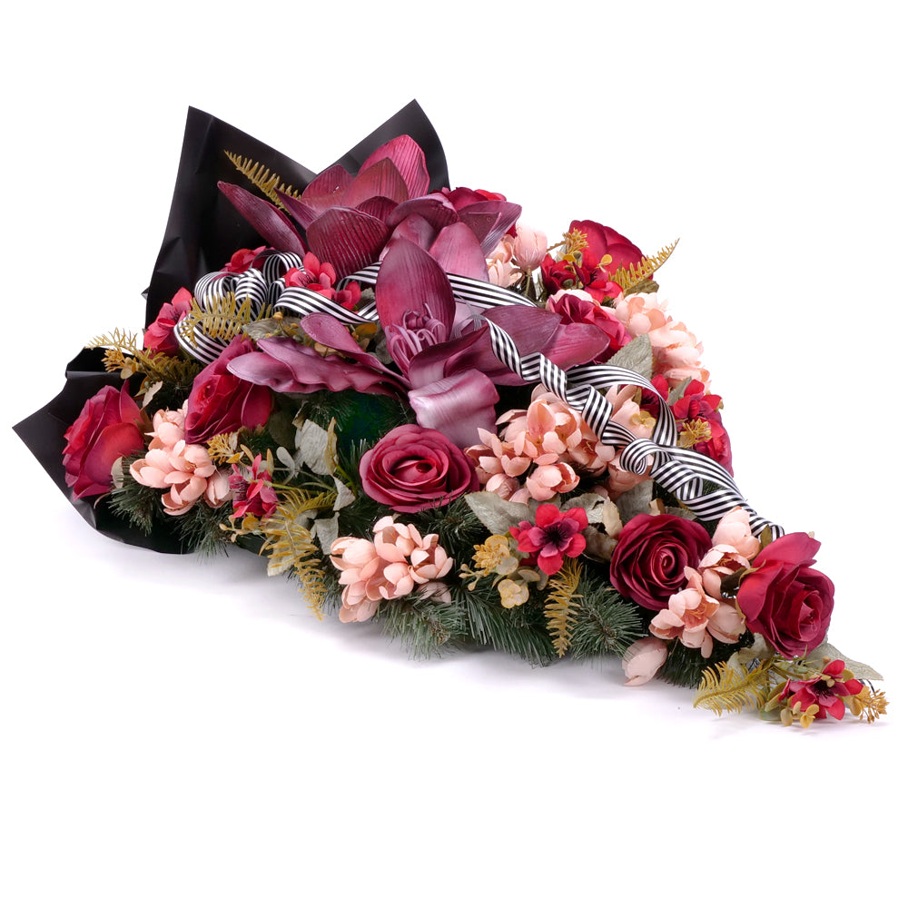 Smútočná kytica z umelých a penových kvetov bordovej, marhuľovej a červenej farby. Podklad aranžmánu tvorí základ z umelej čačiny. Súčasťou je smútočný dekoračný papier a stuha. Na pohrebné smútočné kytice je možné doplniť stuhu, na ktorú je možné napísať odkaz s posledným zbohom s dĺžkou maximálne do 60 znakov. Text na stuhu uveďte pri vystavovaní objednávky v poznámke zákazníka. Čítať viac