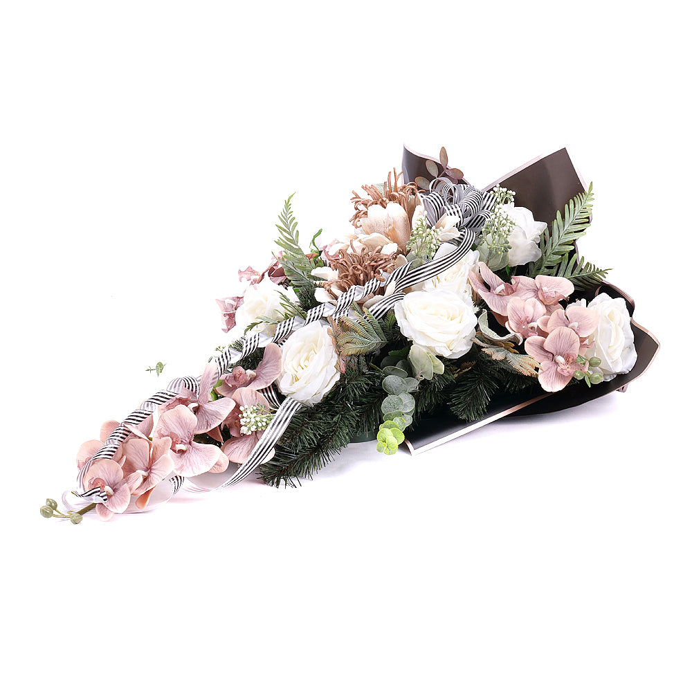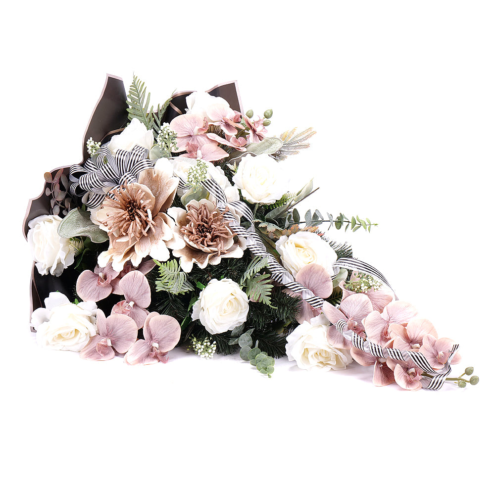 Smútočná kytica v kombinácii hnedej a bielej farby je vyrobená z kvalitných umelých a penových kvetov, ktoré symbolizujú úctu, pokoj a večnosť. Biela farba prináša pocit čistoty a duchovného pokoja, zatiaľ čo hnedá tónina vyjadruje stabilitu, zemitú dôsto Čítať viac