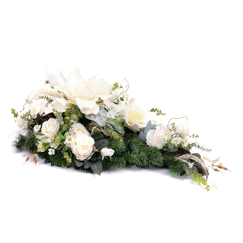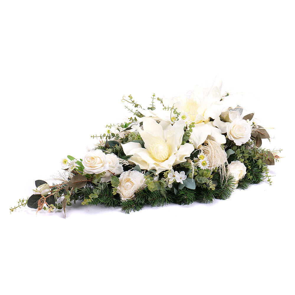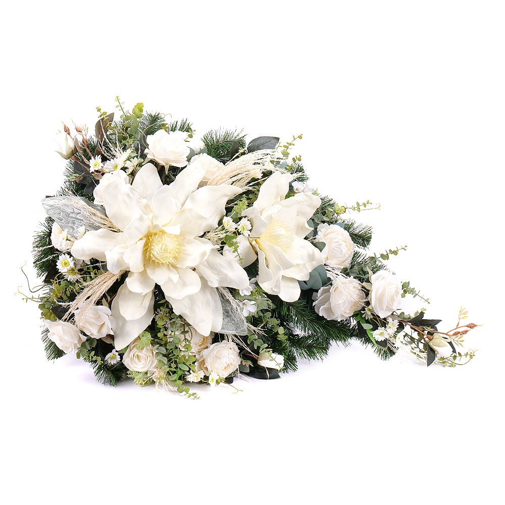 Smútočná kytica z bielych kvetov a penovej magnólie na podklade z umelej čačiny vyžaruje eleganciu a krásu. Jemné biele kvety... Čítať viac