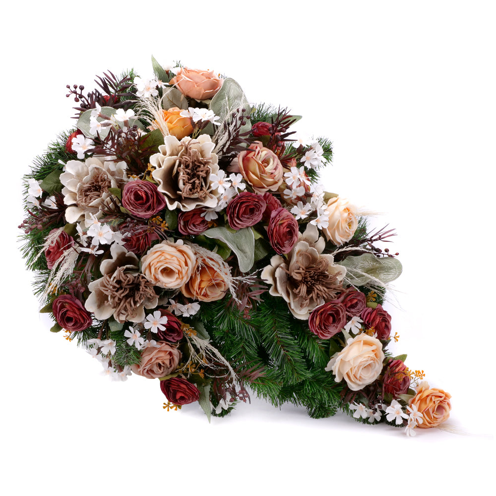 Smútočný aranžmán v tvare slzy z penových kvetov, umelých kvetov hnedej, krémovej a oranžovej farby. Základ aranžmánu tvorí slza z umelej čačiny. Na pohrebné smútočné kytice je možné doplniť stuhu, na ktorú je možné napísať odkaz s posledným zbohom s dĺžkou maximálne do 60 znakov. Text na stuhu uveďte pri vystavovaní objednávky v poznámke zákazníka.