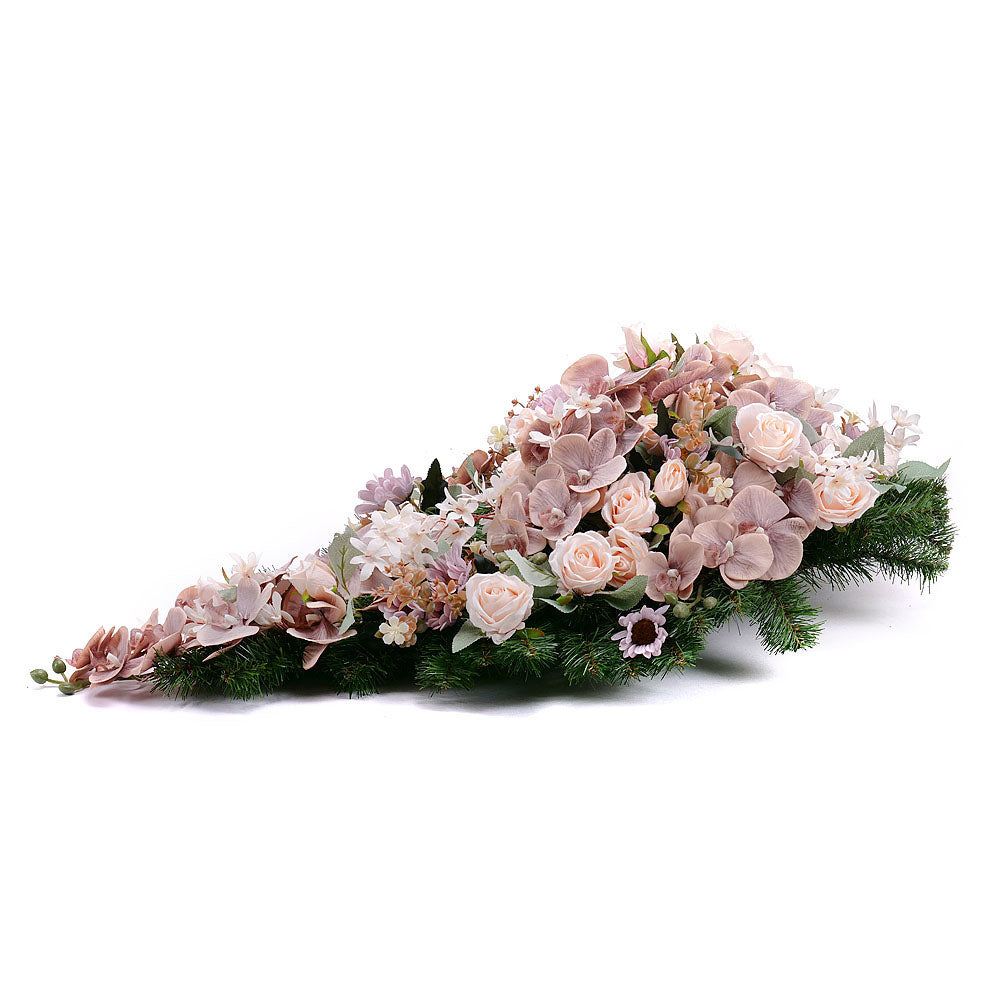 Uctite si tých, ktorí Vám chýbajú, umelým vencom v tvare slzy v jemnej ružovo - fialovej farbe z umelých kvetov ruží, orchidíí a dekoračných doplnkov.
