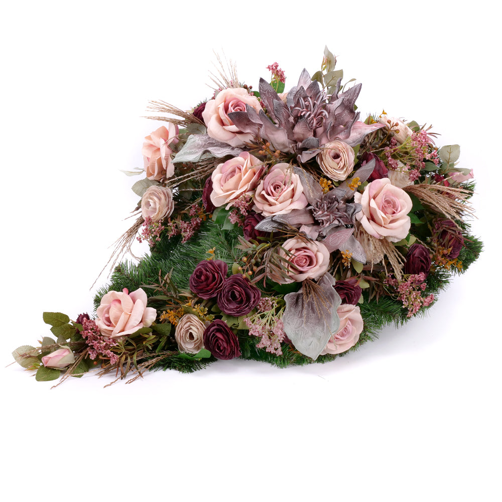 Aranžmán v tvare srdca z umelej čačiny s penovvými a umelými kvetmi jemnej ružovej a bordovej farby. Na pohrebné smútočné kytice je možné doplniť stuhu, na ktorú je možné napísať odkaz s posledným zbohom s dĺžkou maximálne do 60 znakov. Text na stuhu uveďte pri vystavovaní objednávky v poznámke zákazníka. Čítať viac