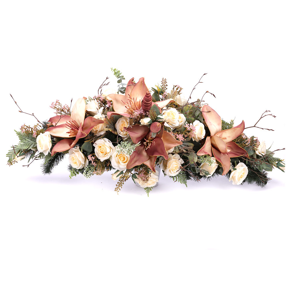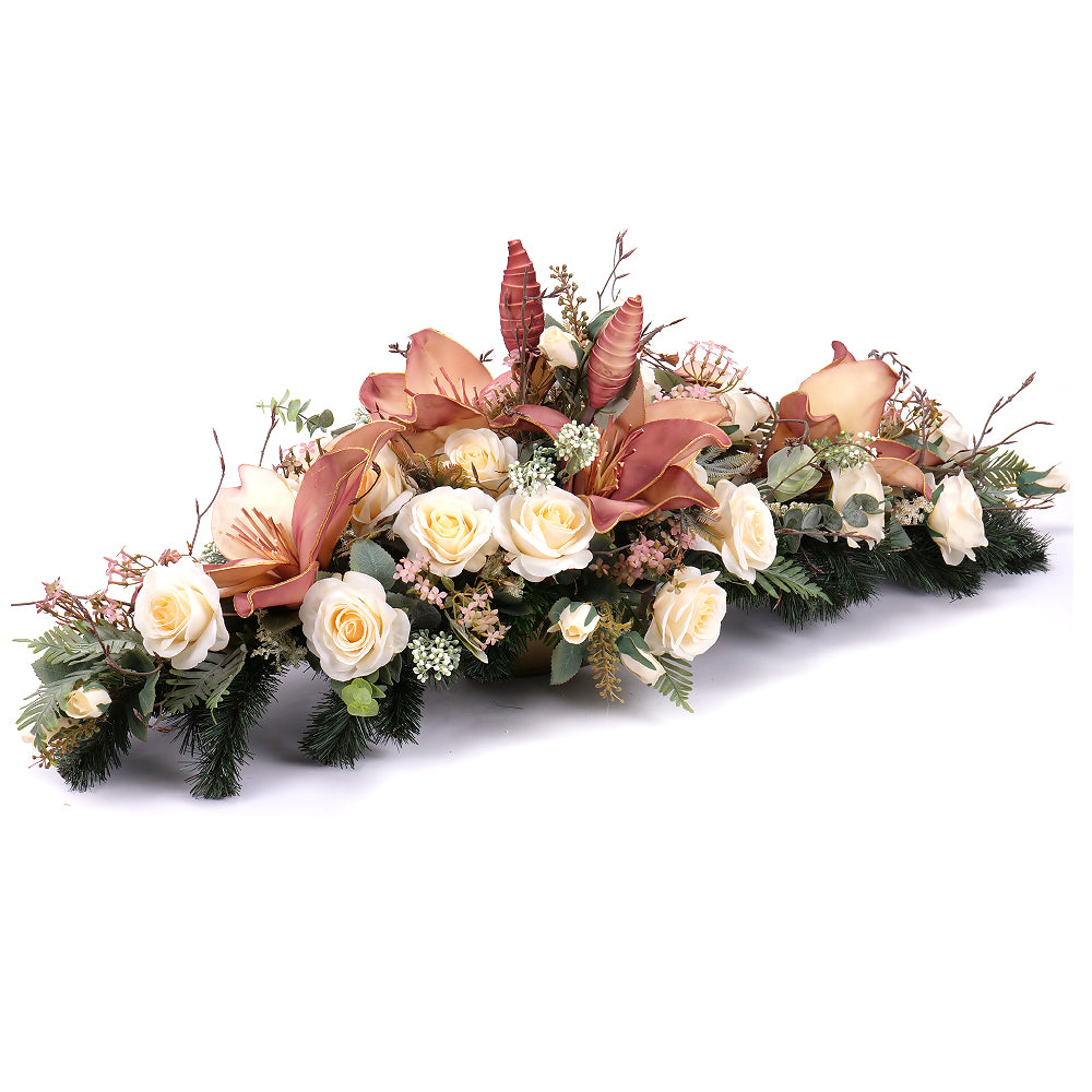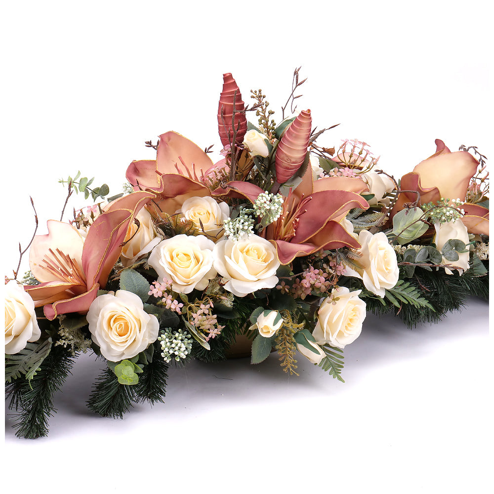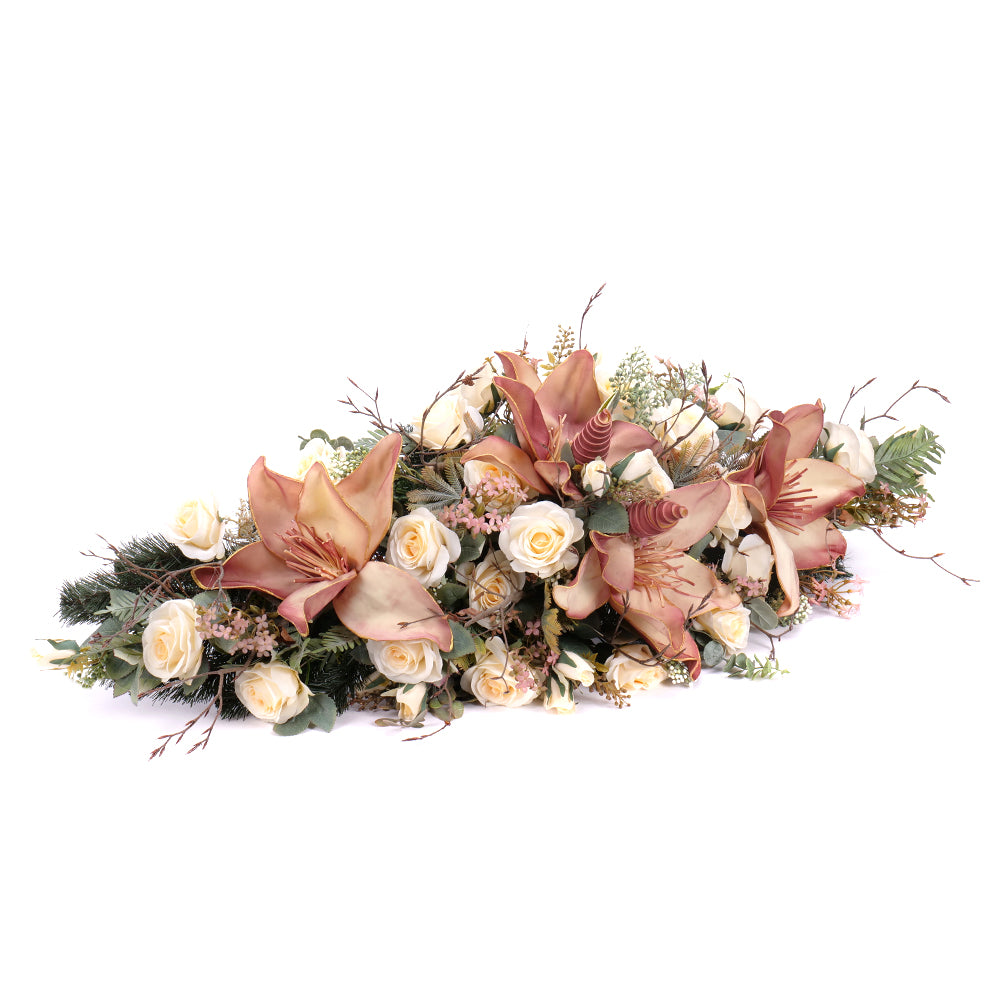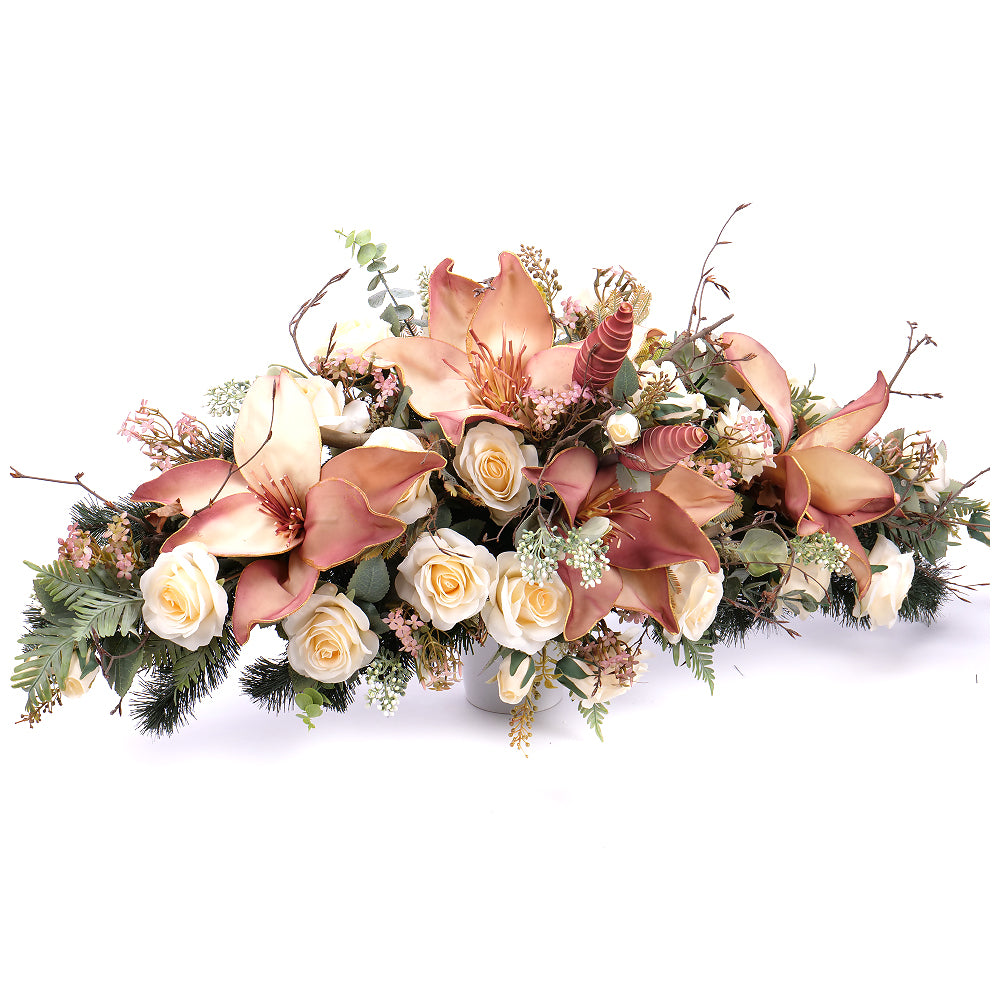 Smútočný aranžmán z umelých a penových kvetov v jemnej krémovej a prírodnej farbe. Aranžmány od spoločnosti Kvety.sk obsahujú umelé a sušené kvety, ktoré vyzerajú ako živé. Spodná časť je tvorená umelou čačinou.