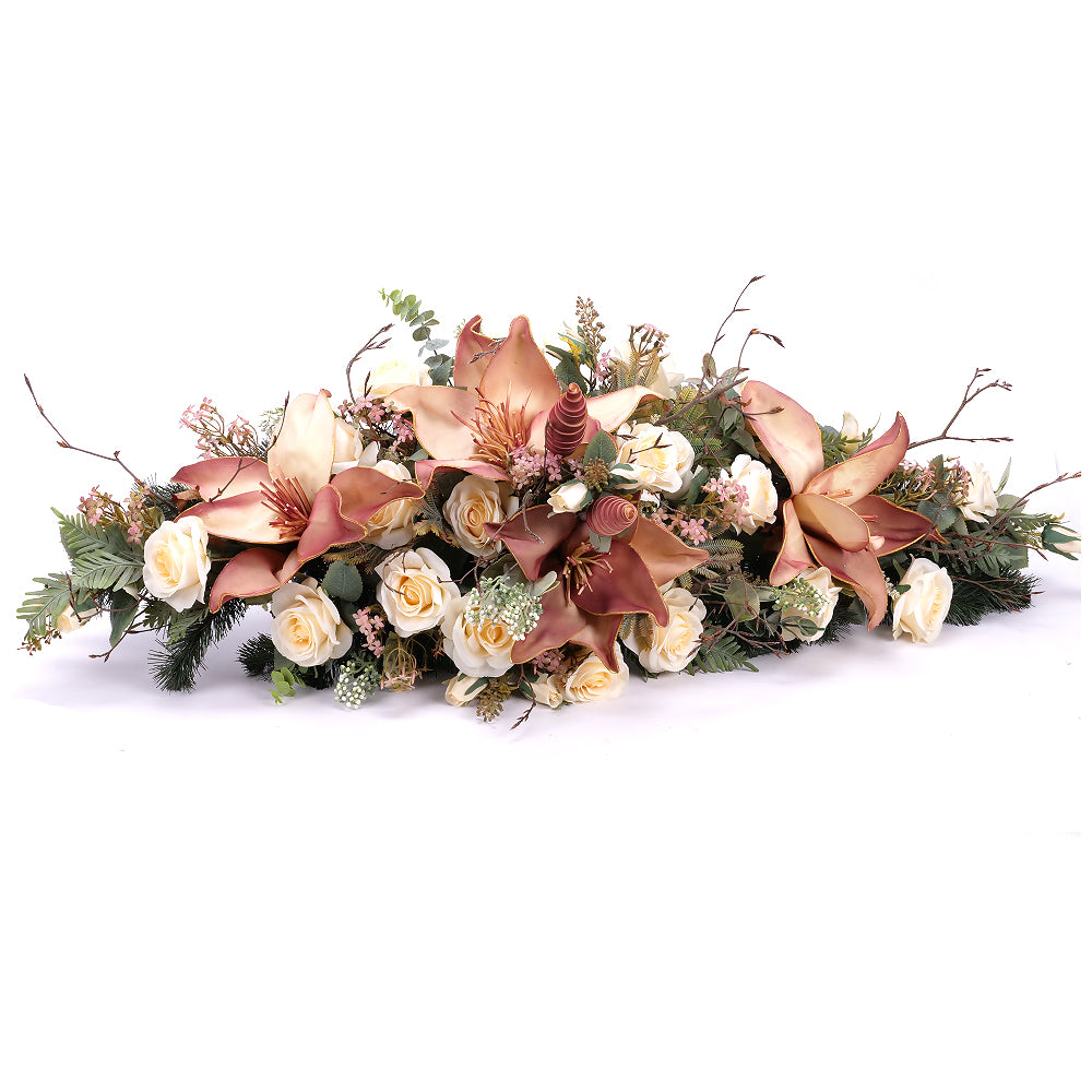 Smútočný aranžmán z umelých a penových kvetov v jemnej krémovej a prírodnej farbe. Aranžmány od spoločnosti Kvety.sk obsahujú umelé a sušené kvety, ktoré vyzerajú ako živé. Spodná časť je tvorená umelou čačinou. Čítať viac