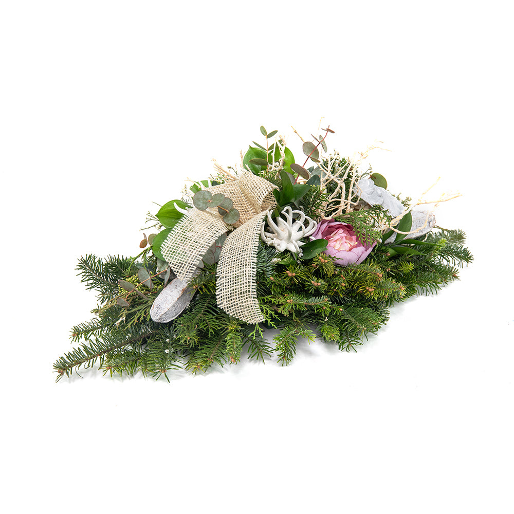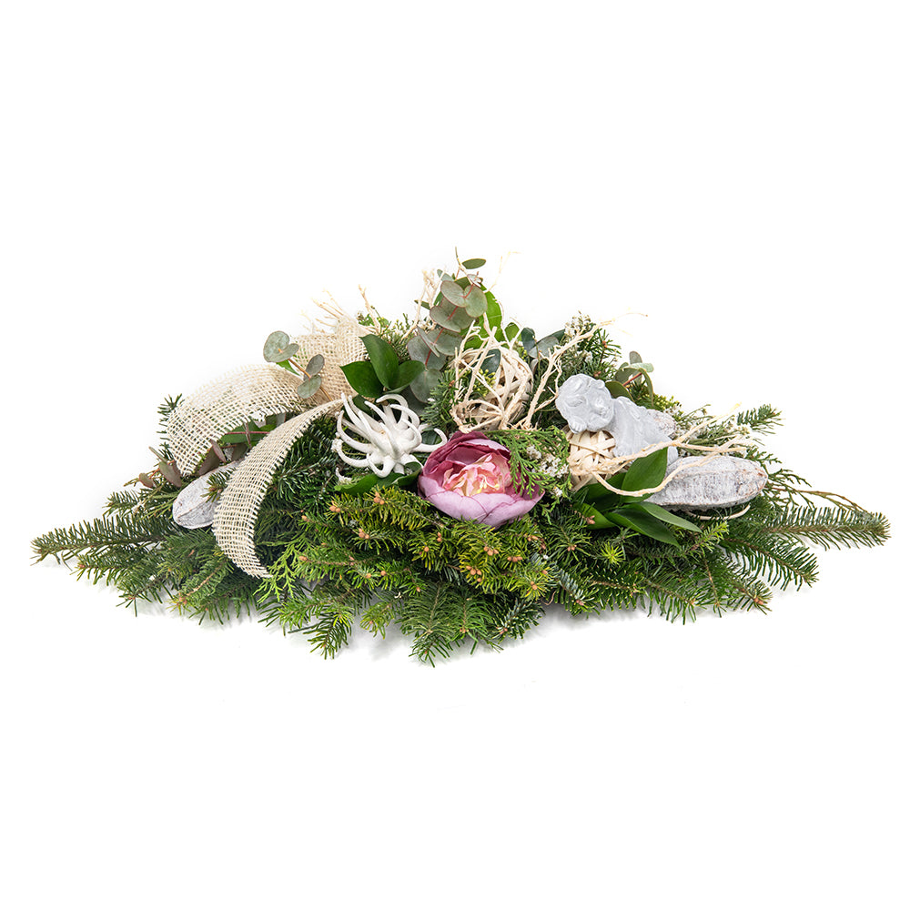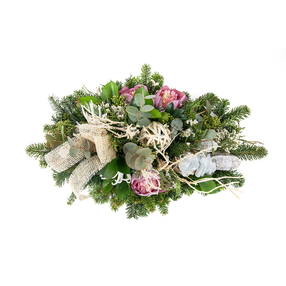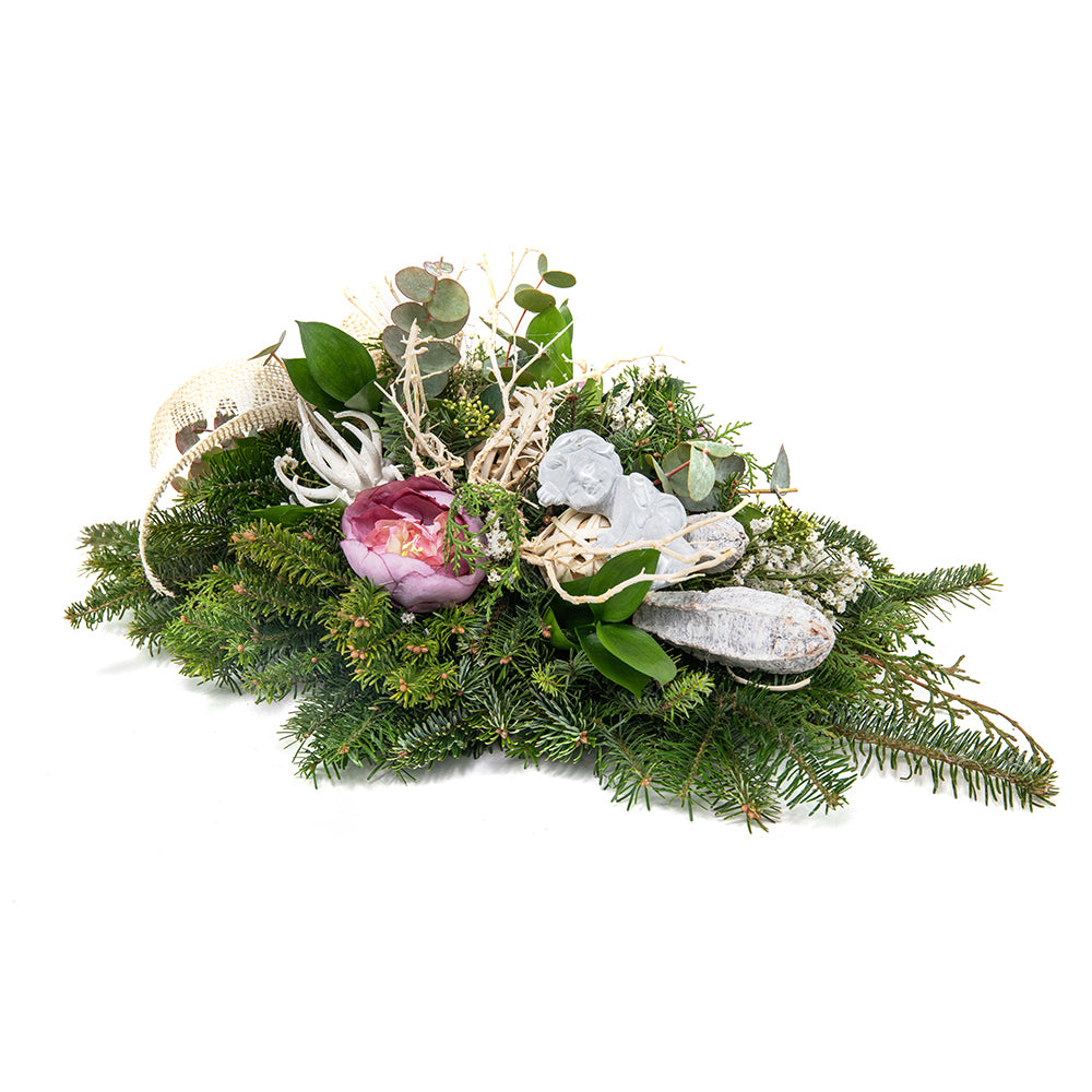 Irigo smútočný aranžmán živá čačina fialové kvety anjel