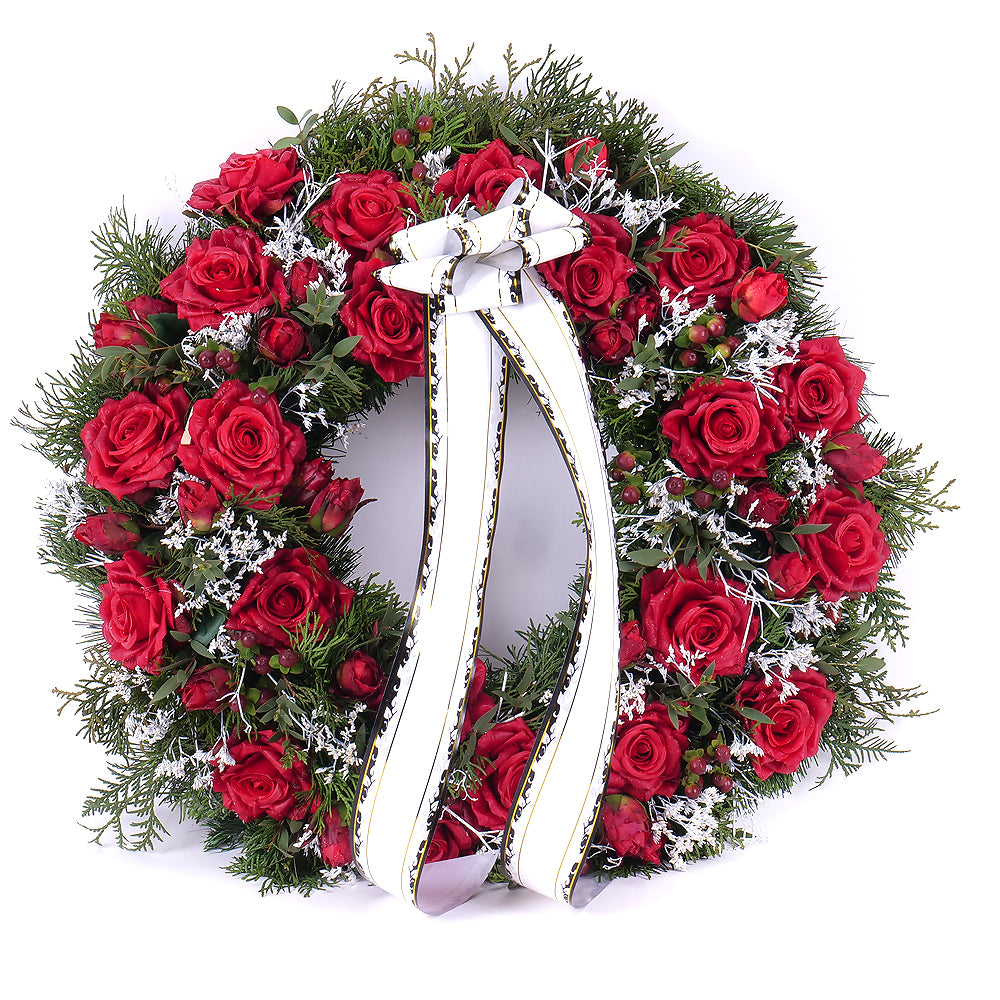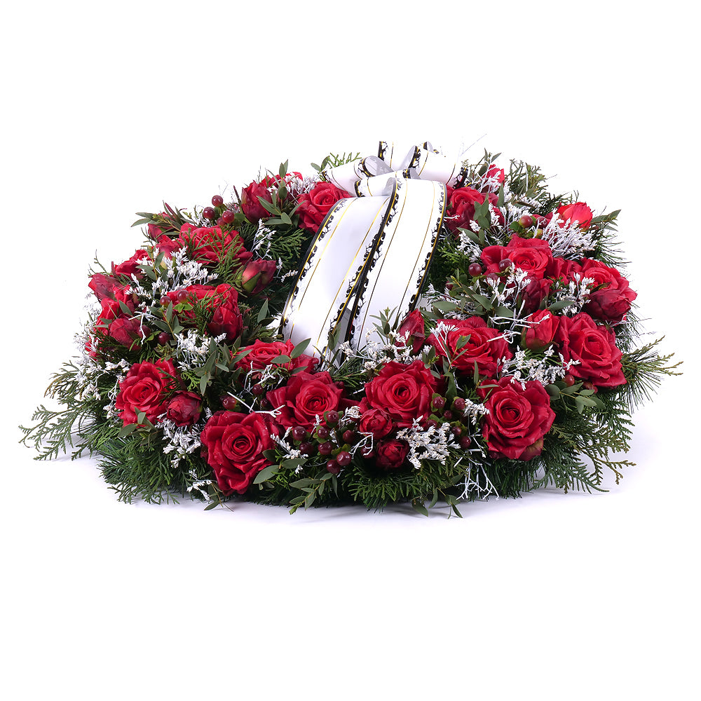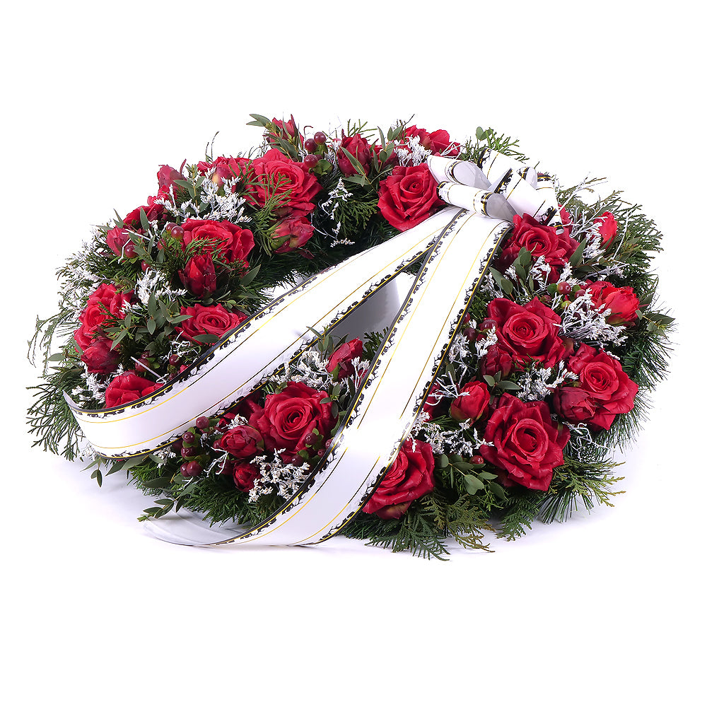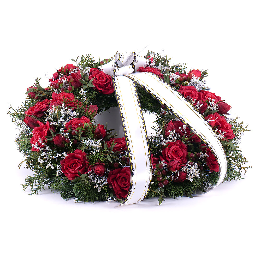Irigo smútočný čačinový veniec červené ruže