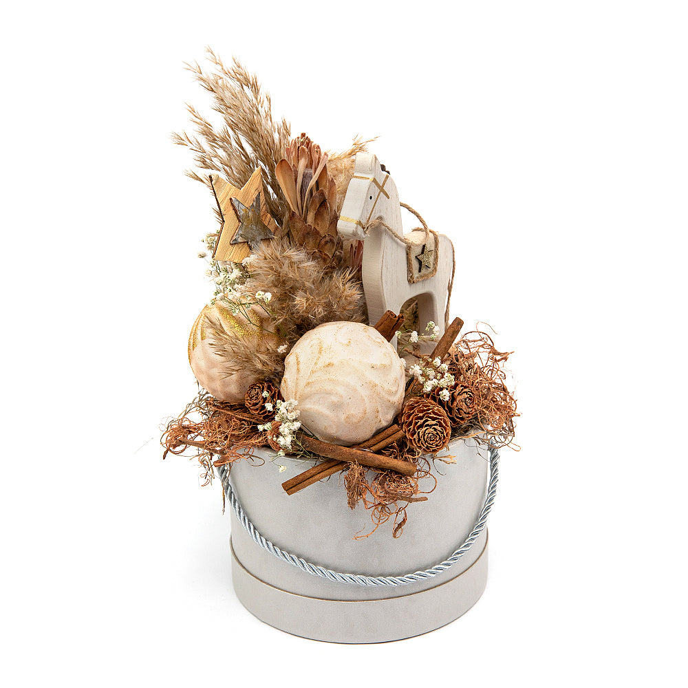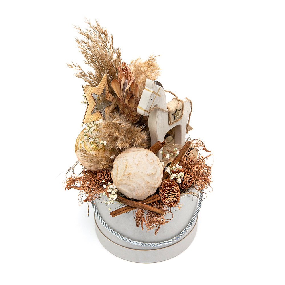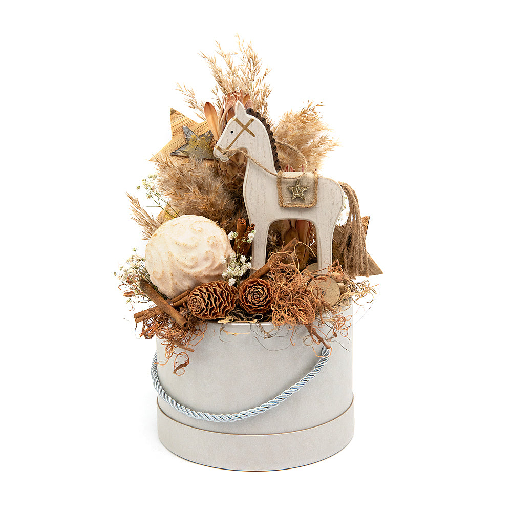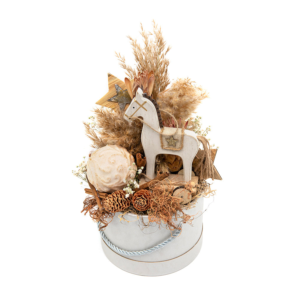 Darčekový prírodný box s vianočným aranžmánom a dekoračným dreveným koníkom. Čítať viac