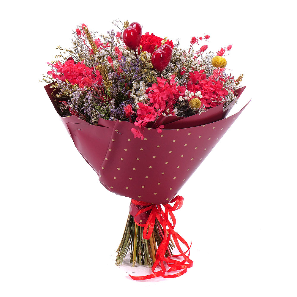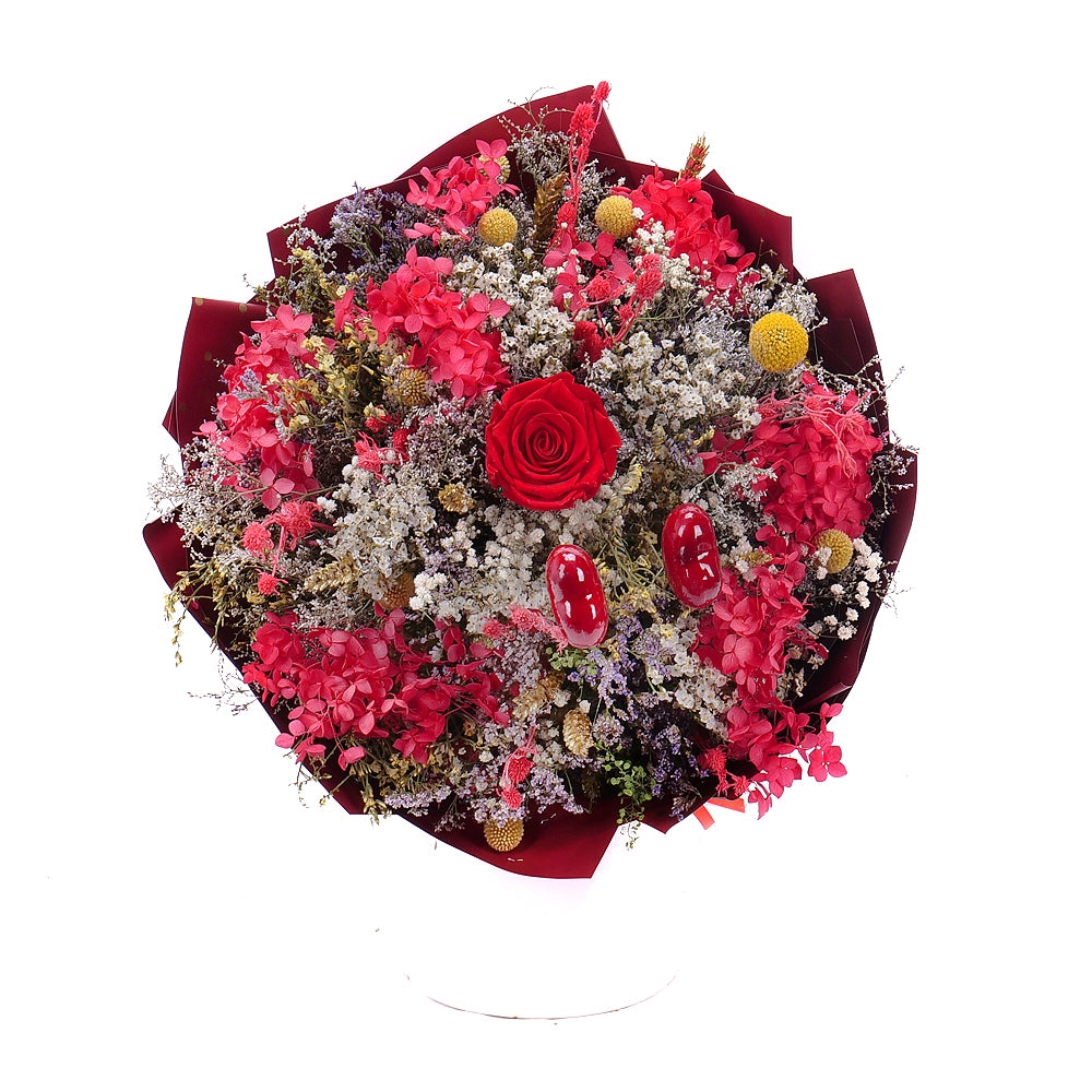Sušená kytica s červenou In Eterno ružou je stelesnením vášne a elegancie. Výrazná červená ruža, ktorá si zachováva svoju krásu dlhé mesiace, je doplnená starostlivo vybranými sušenými kvetmi a prírodnými prvkami v harmonickej kompozícii. Táto kytica je d Čítať viac