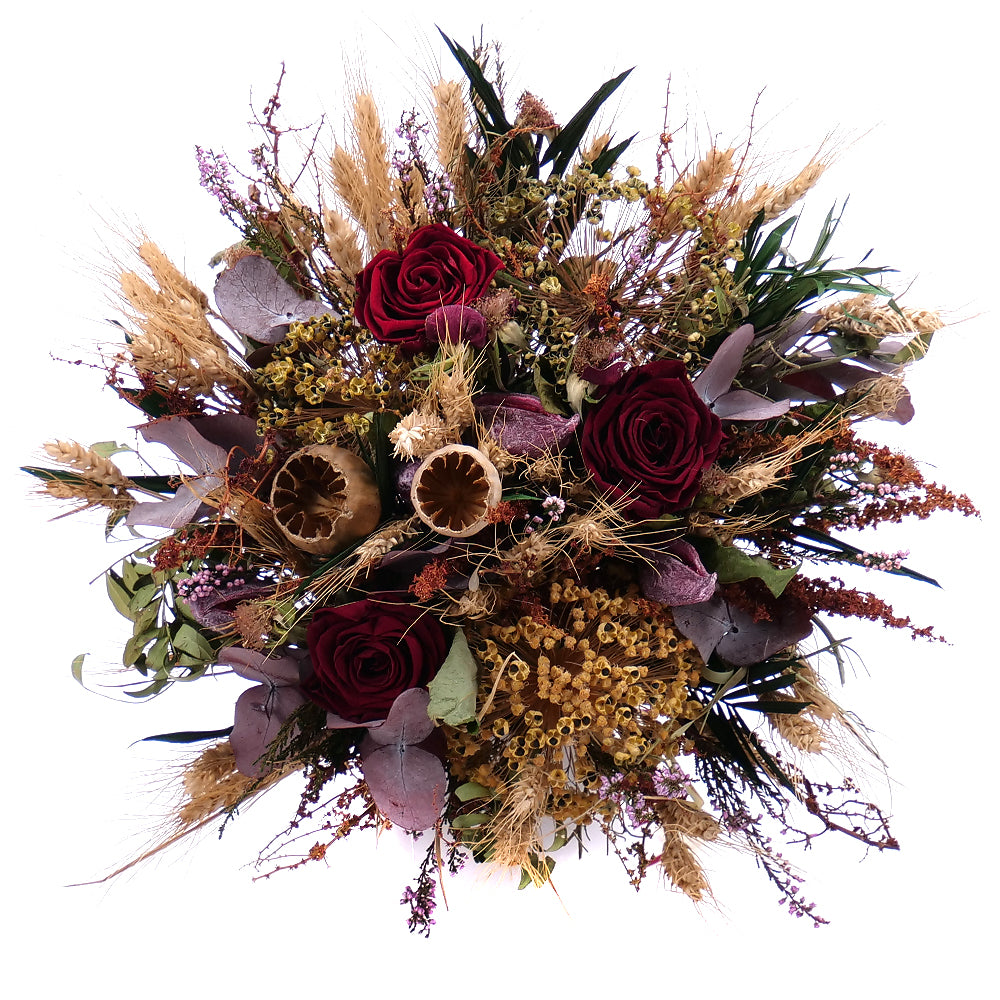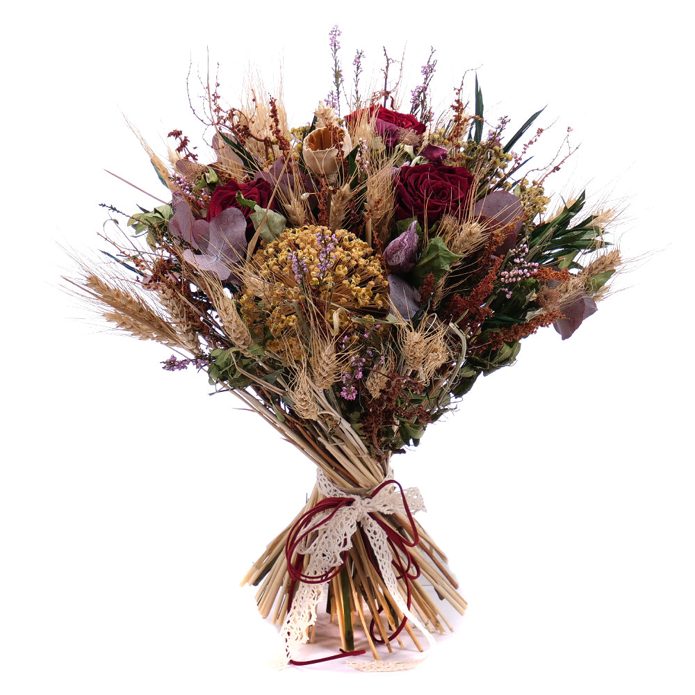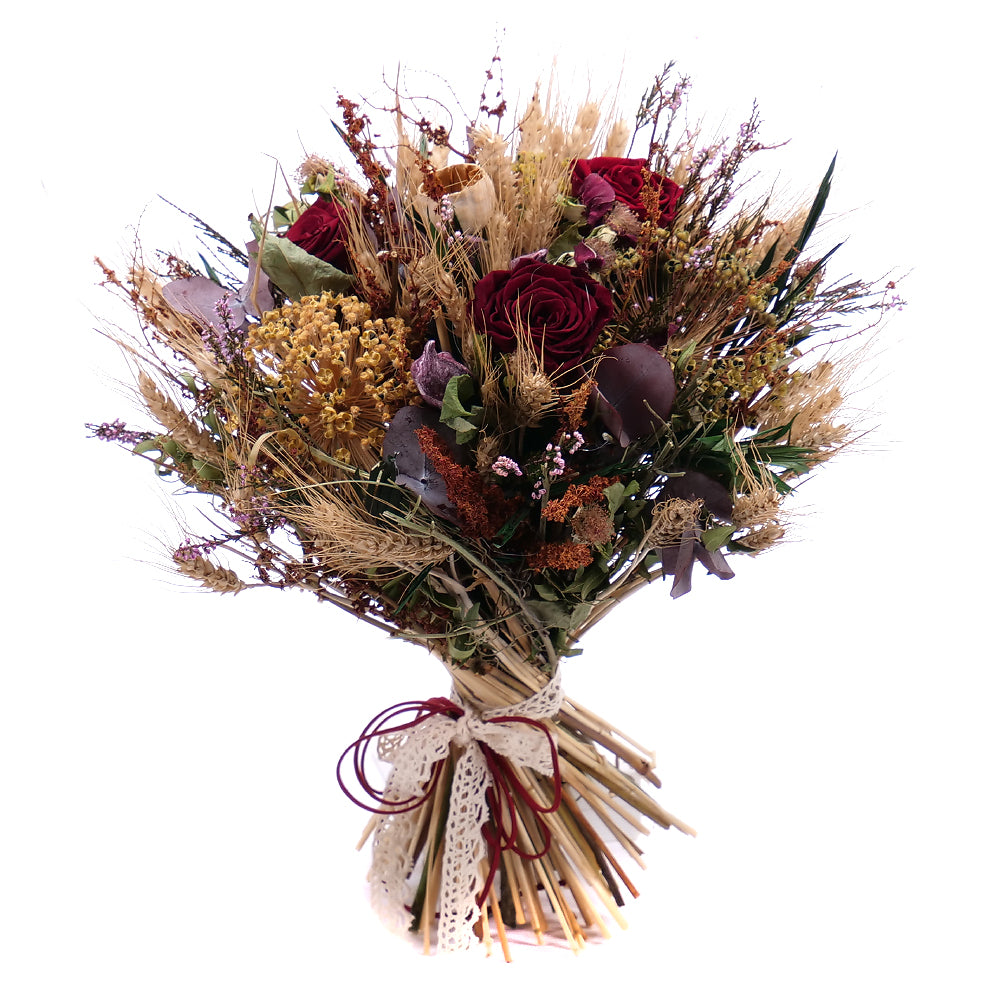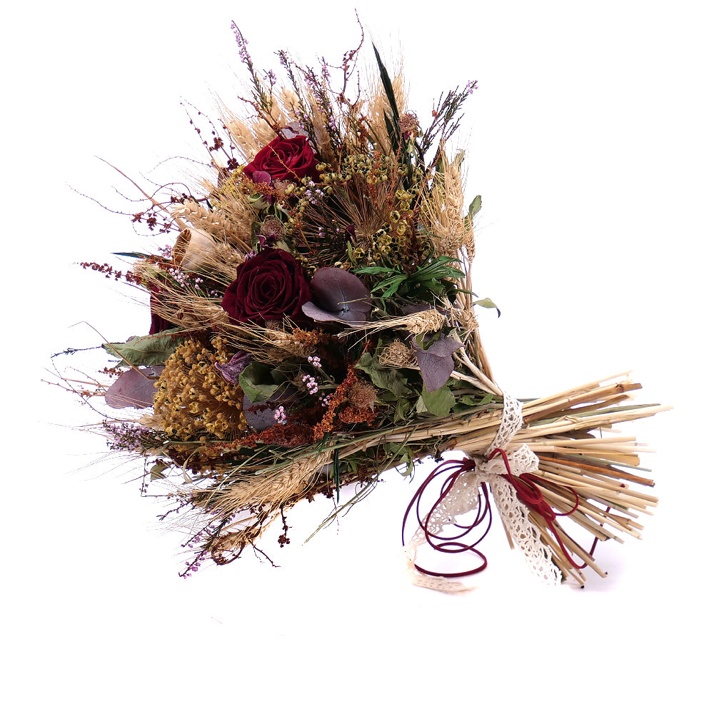 Sušená kytica s In Eterno preparovanými ružami, prírodnými a sušenými doplnkami doplnená krajkovou stuhou a dekoračným lankom. Čítať viac