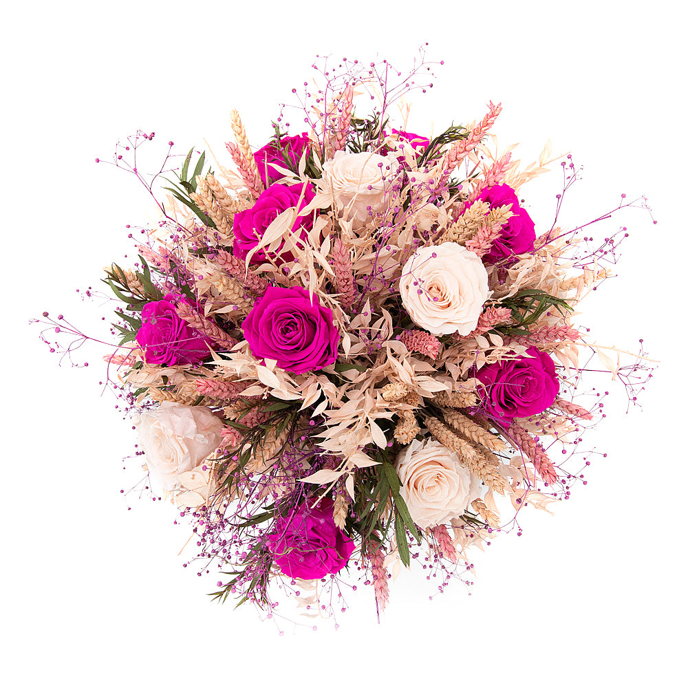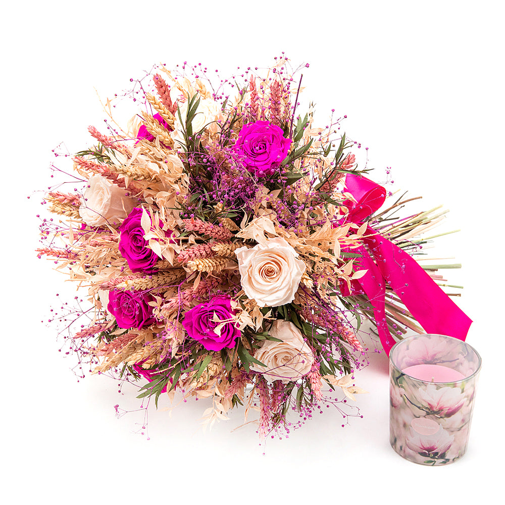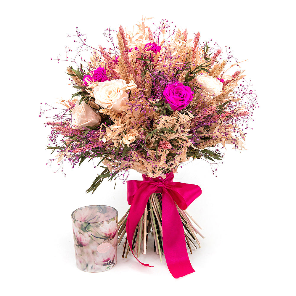 Irigo sušená kytica preparované ružové a cyklámenové ruže sviečka