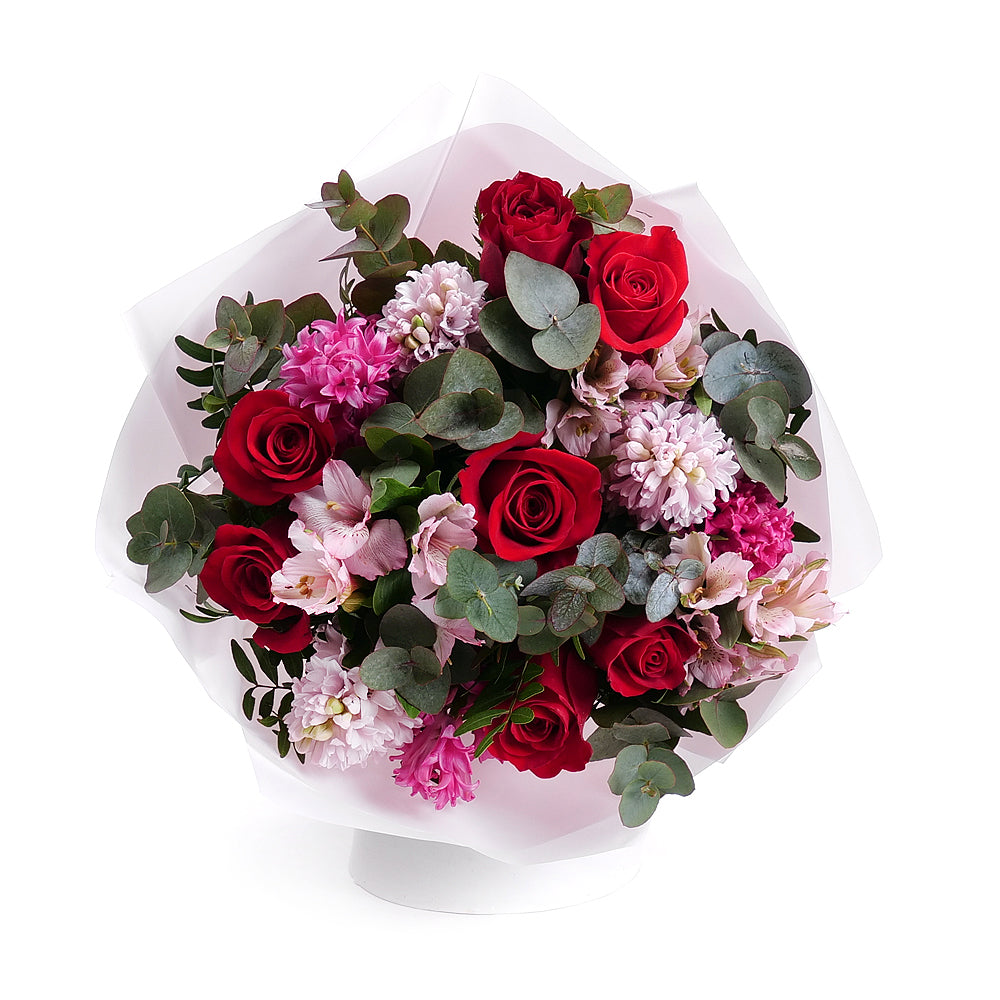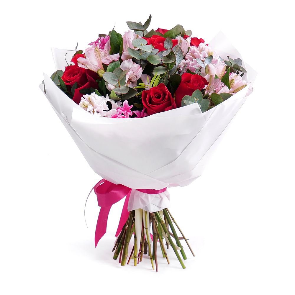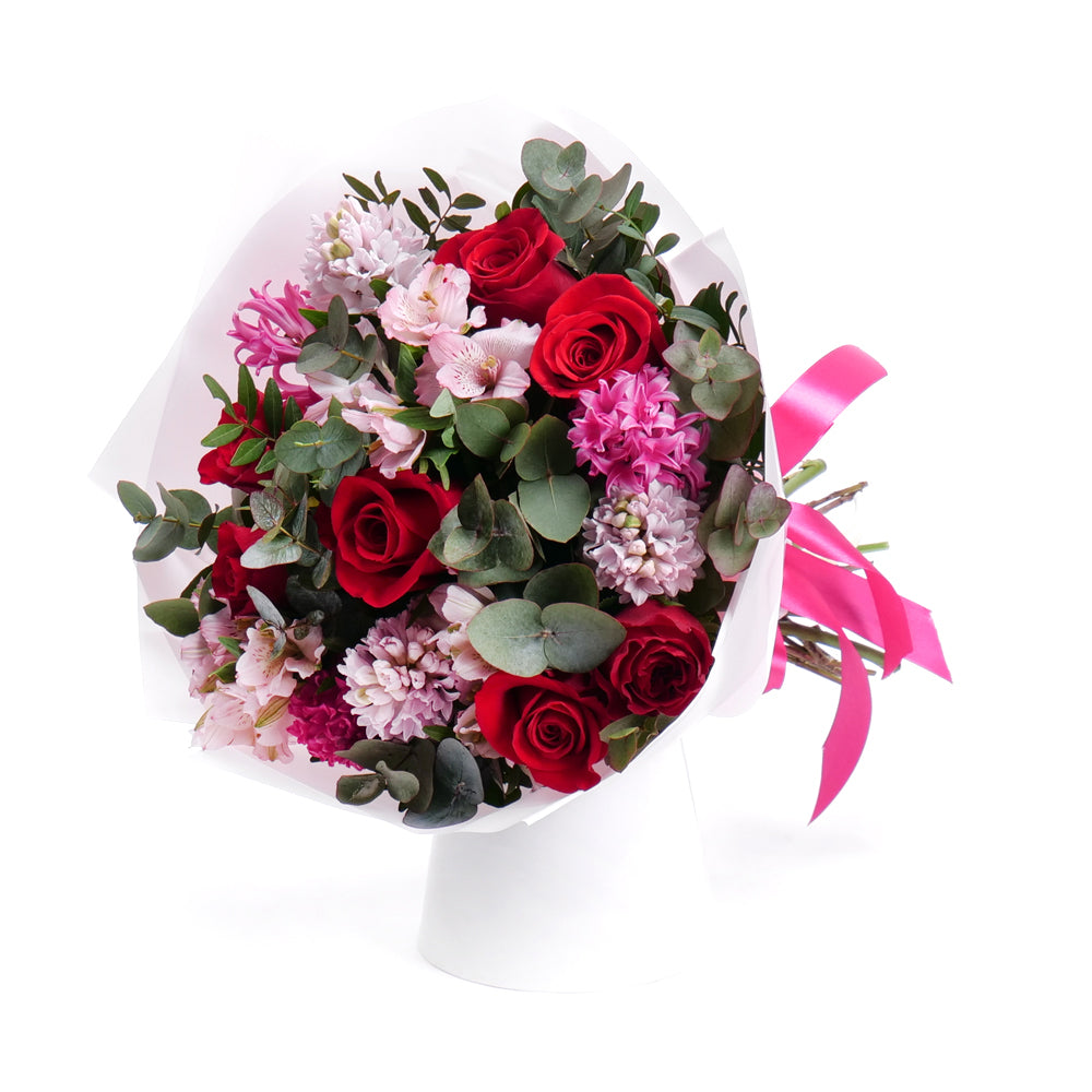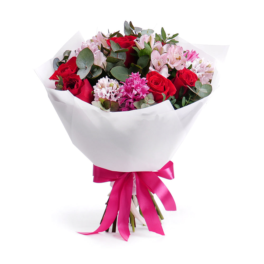 Kytica z ruží, hyacintov a alstromérií. Vhodný darček nielen na sviatok. Len tak pre potešenie.