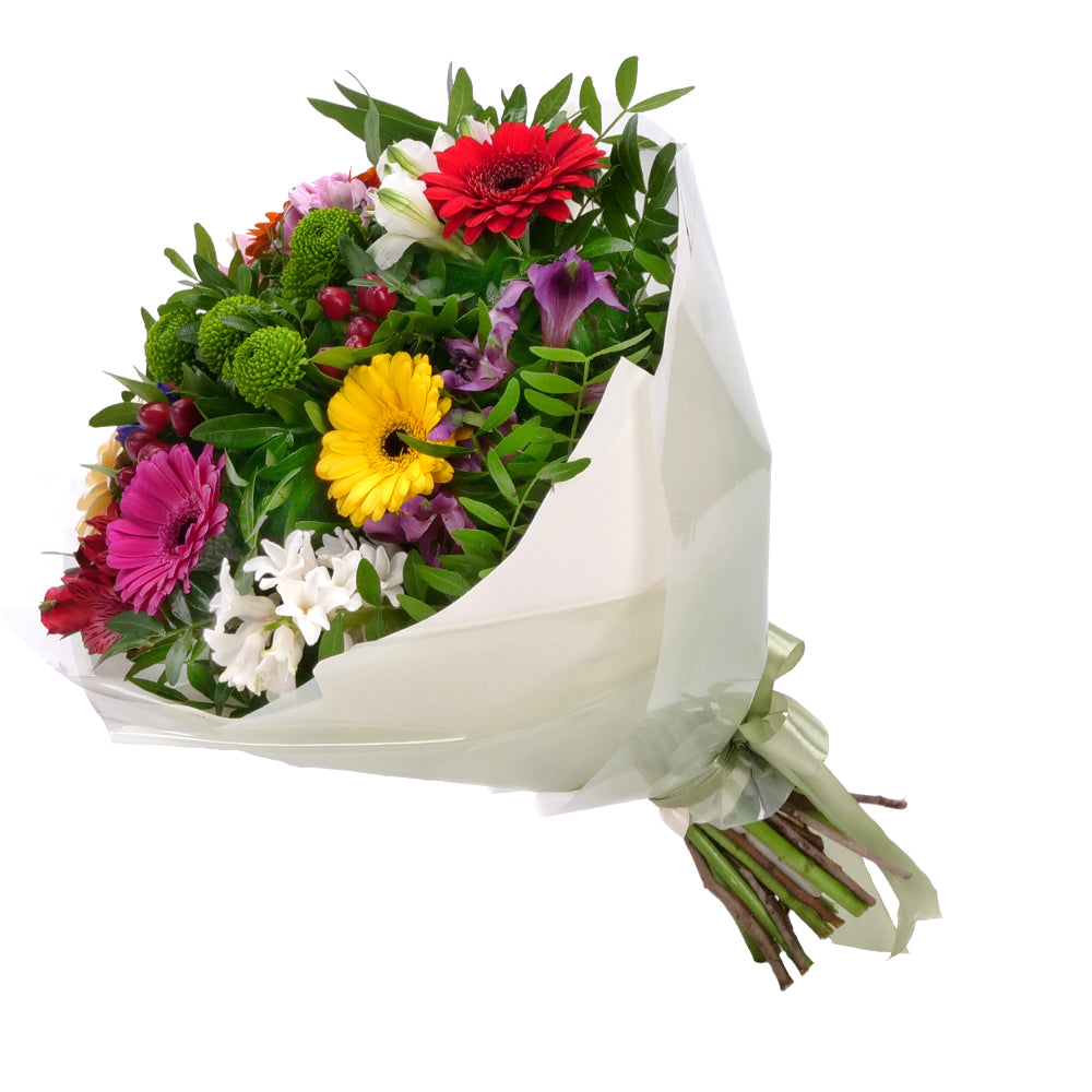 Pestrá jarná kytica z farebných gerbier, alstromérií, hyacintov a santíniek ozdobená dekoratívnym papierom a saténovou stuhou. Čítať viac